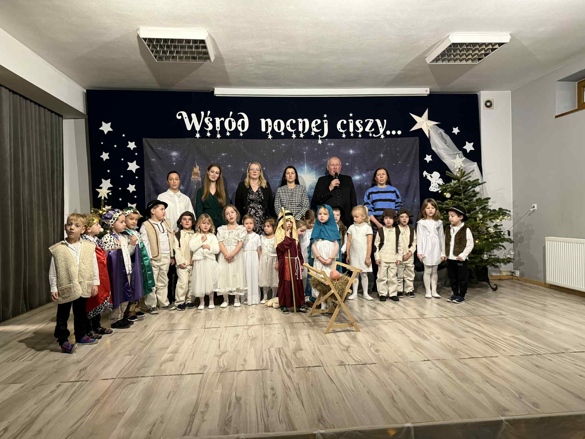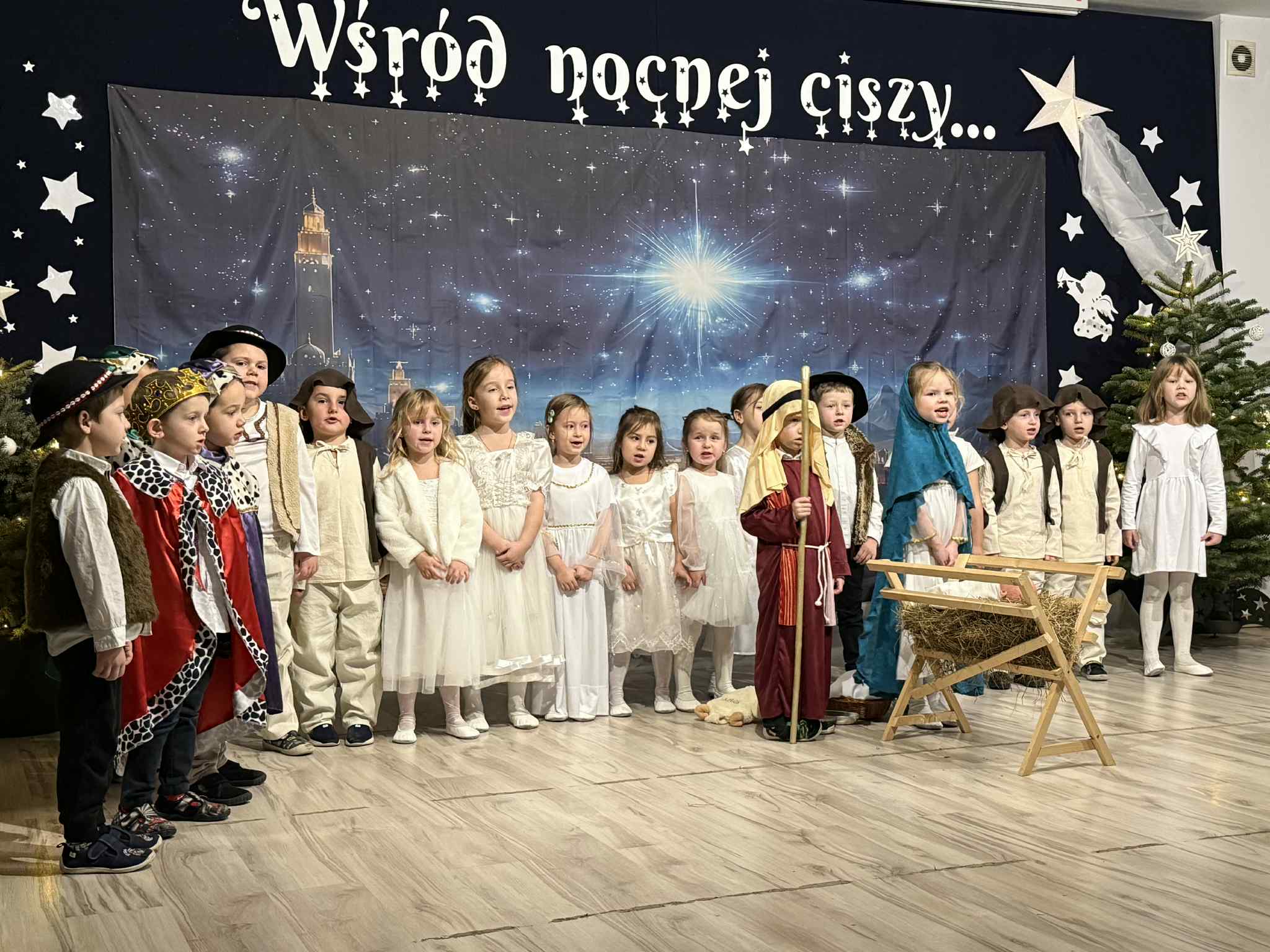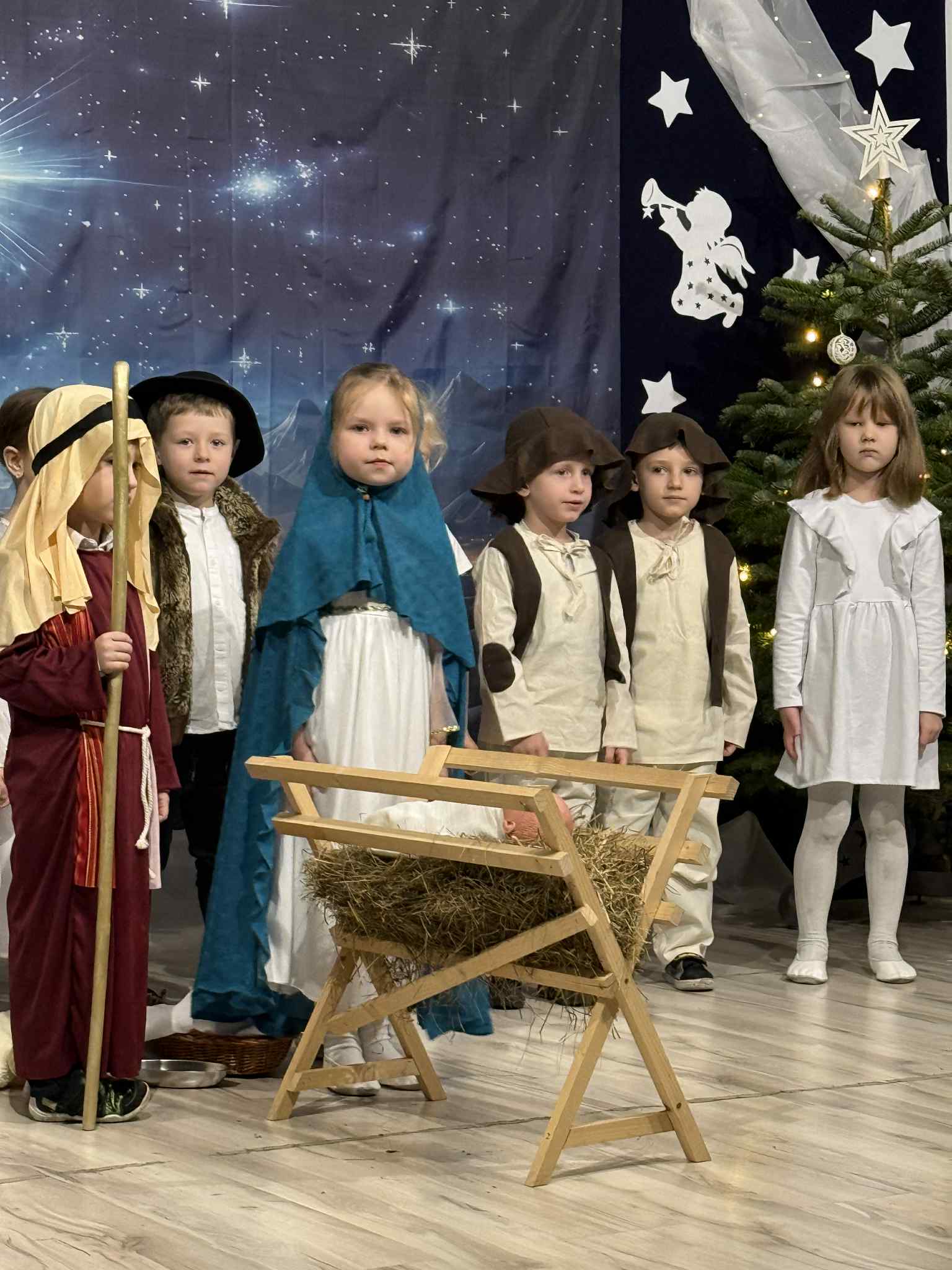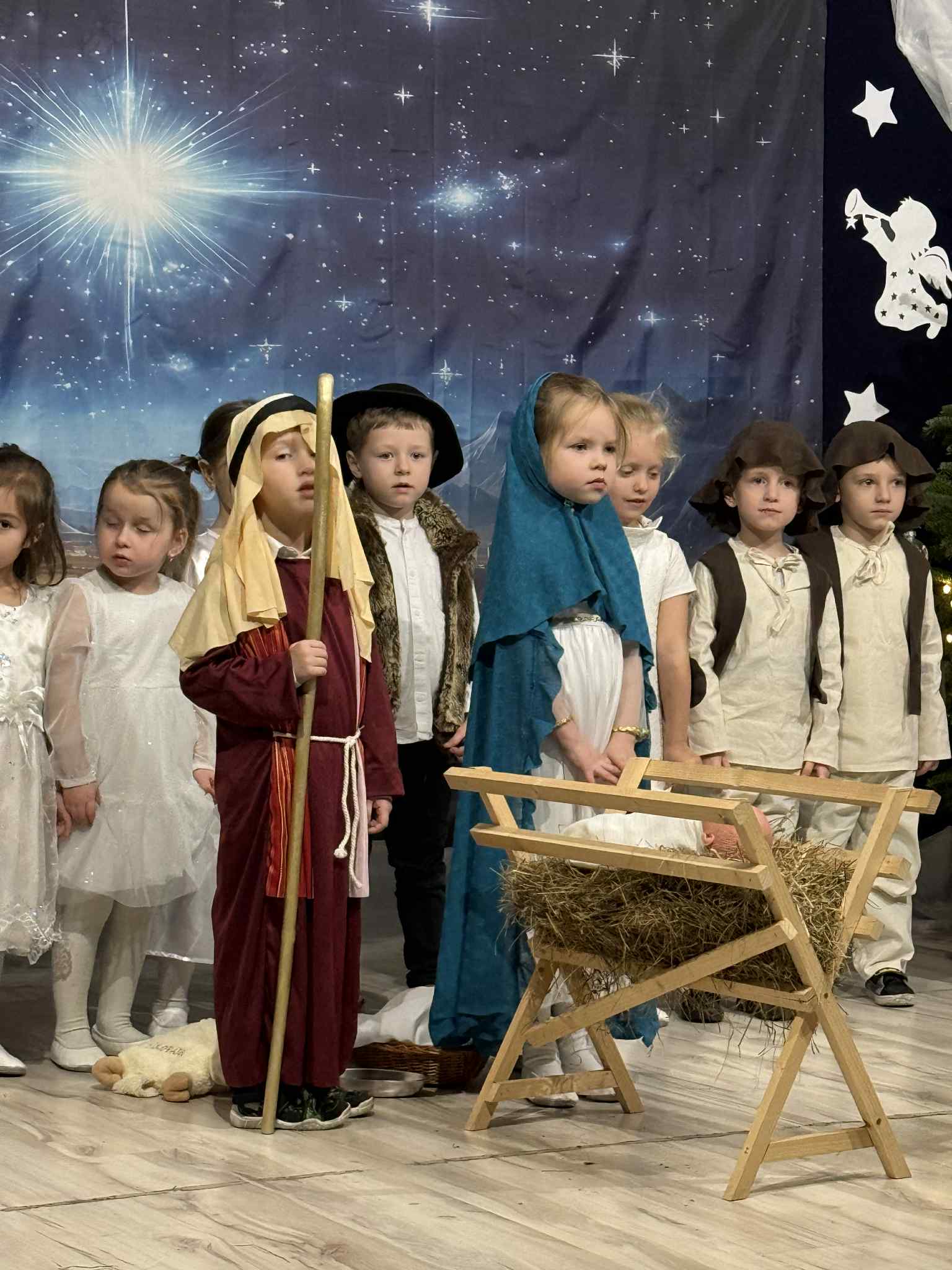 Przedstawienie przygotowały dzieci z grupy Pszczóki, które z ogromnym zaangażowaniem i untuzjazmem zaprezentowały historię narodzin Dzieciątka Jezus. Mali wcielili sie w rolę Maryi, Józefa, aniołów, pasterzy oraz Trzech Króli, zachwycając publiczność pięknymi strojami, śpiewem i odwagą sceniczną.