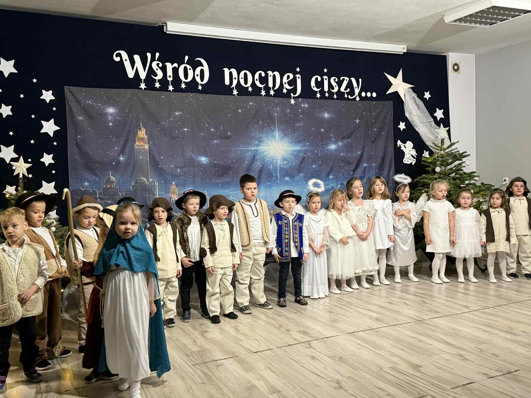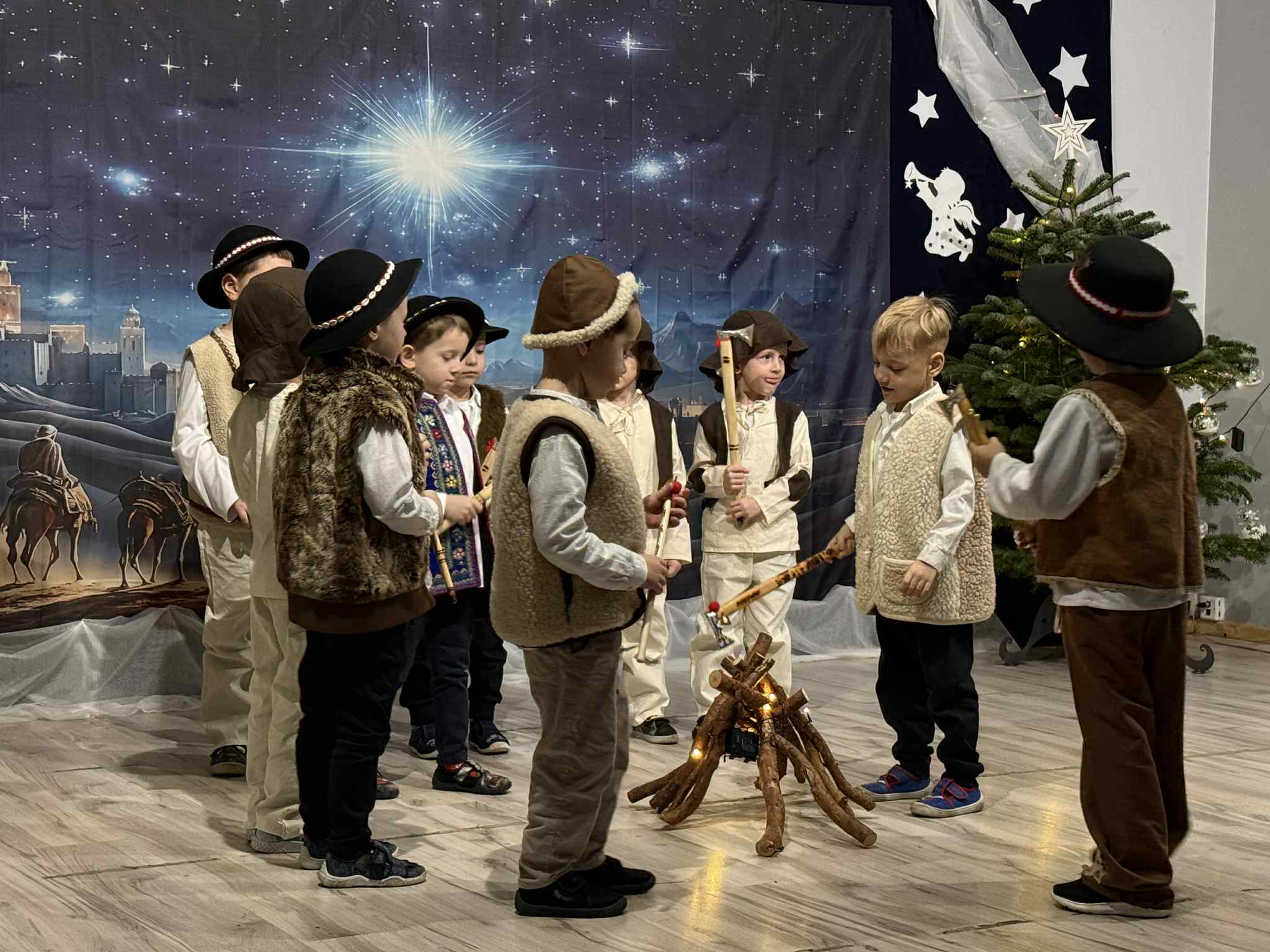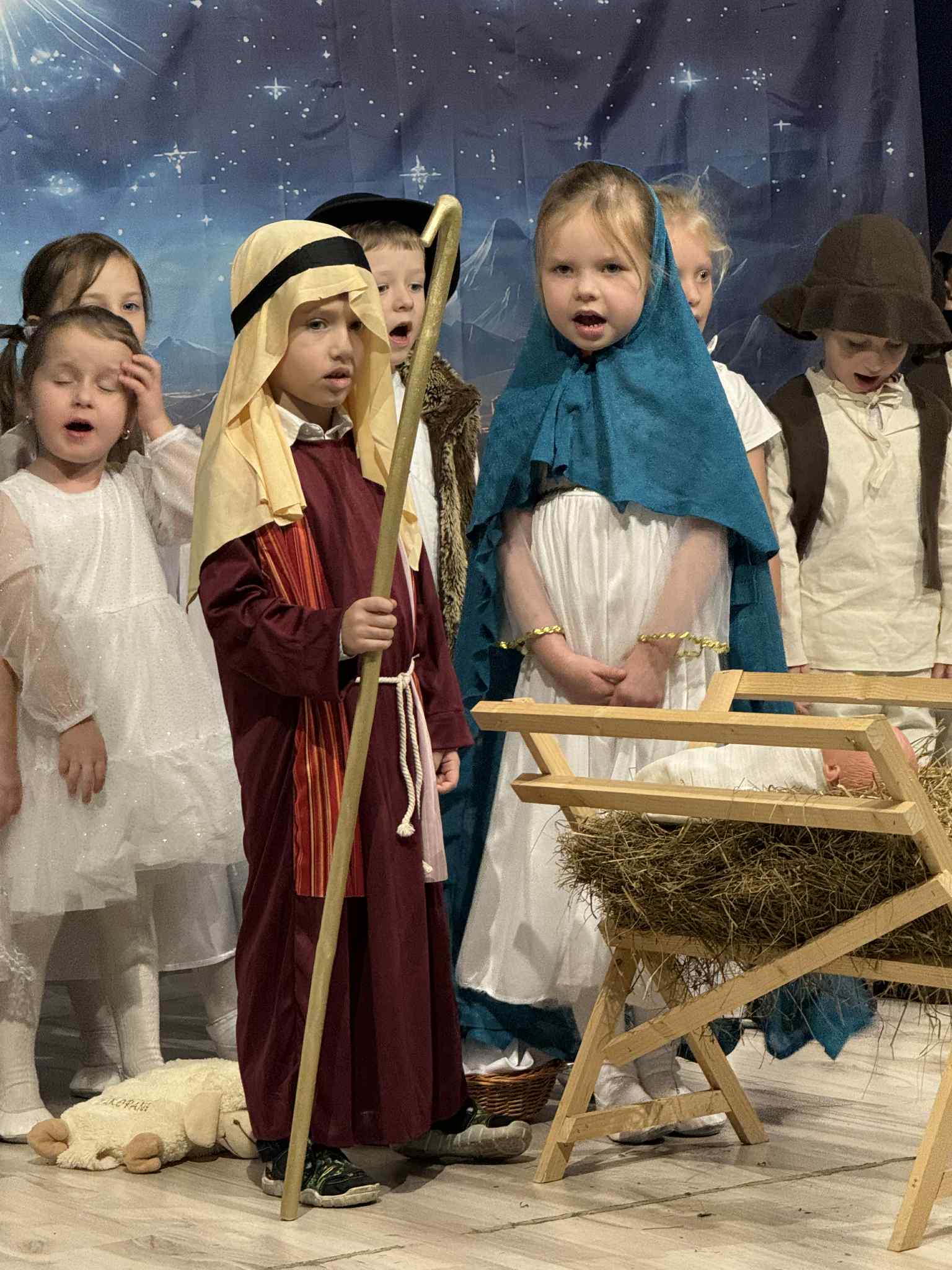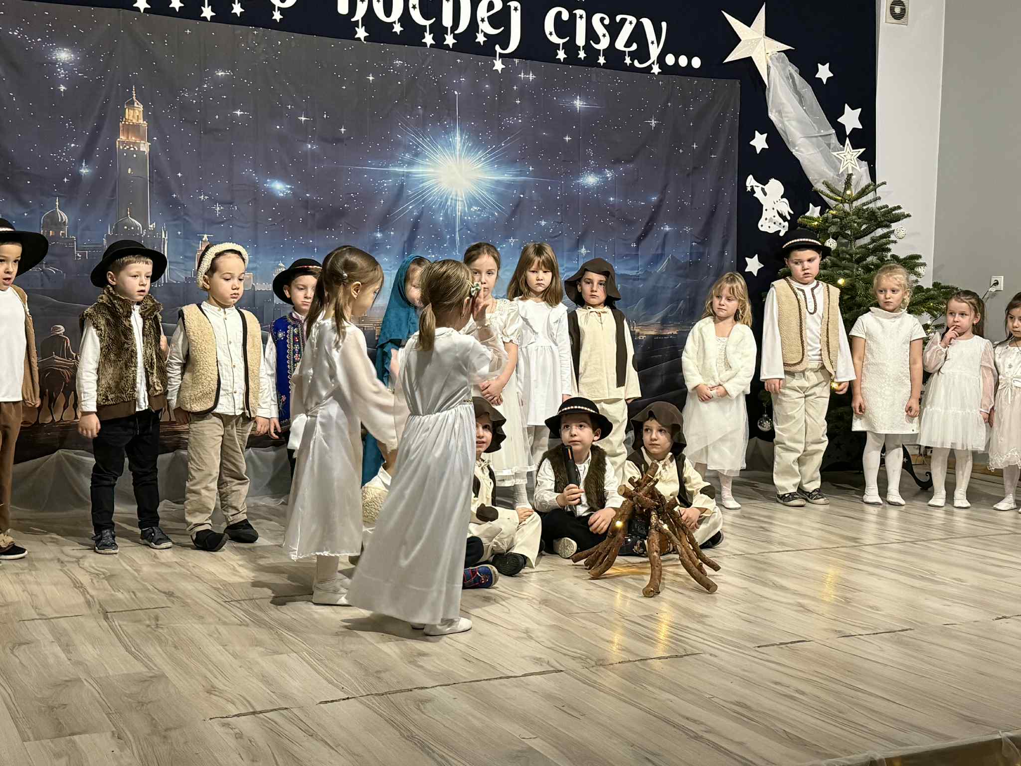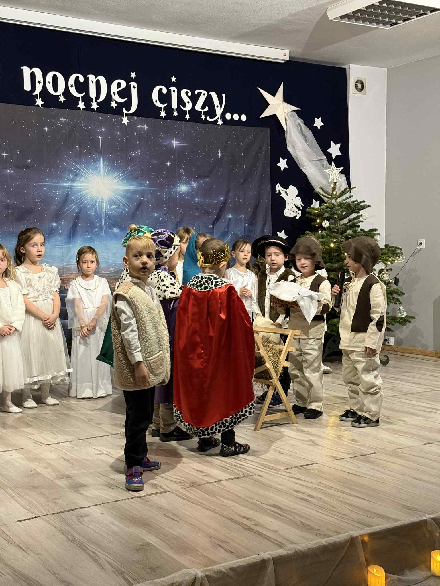 Przedstawienie przygotowały dzieci z grupy Pszczóki, które z ogromnym zaangażowaniem i untuzjazmem zaprezentowały historię narodzin Dzieciątka Jezus. Mali wcielili sie w rolę Maryi, Józefa, aniołów, pasterzy oraz Trzech Króli, zachwycając publiczność pięknymi strojami, śpiewem i odwagą sceniczną.