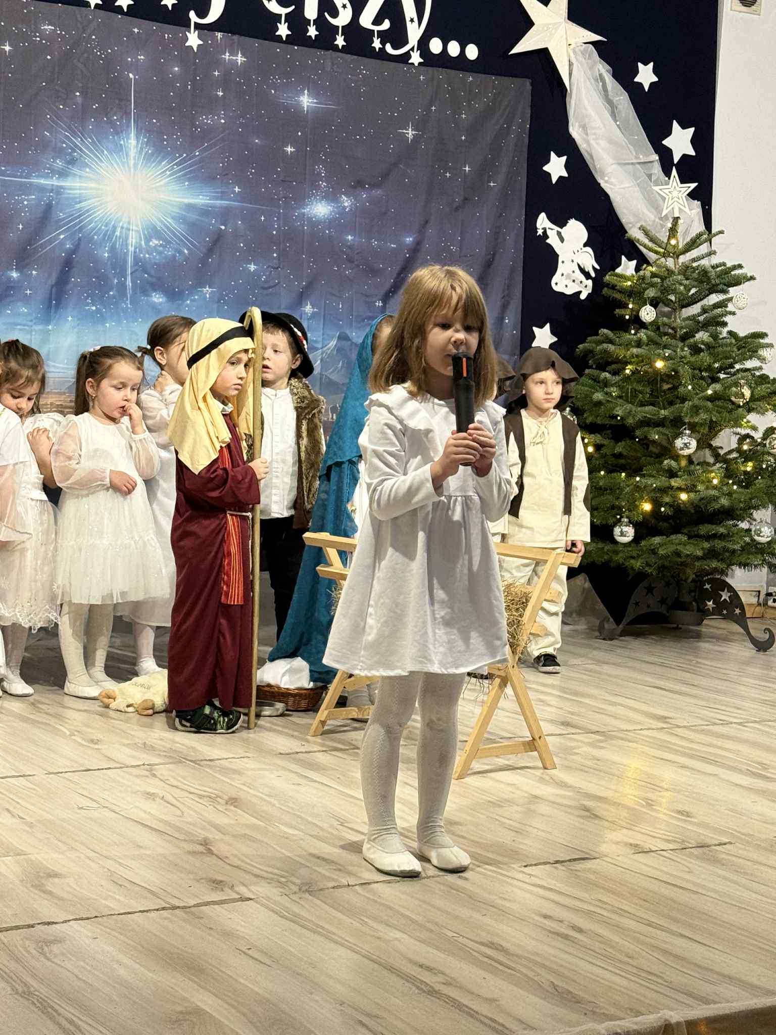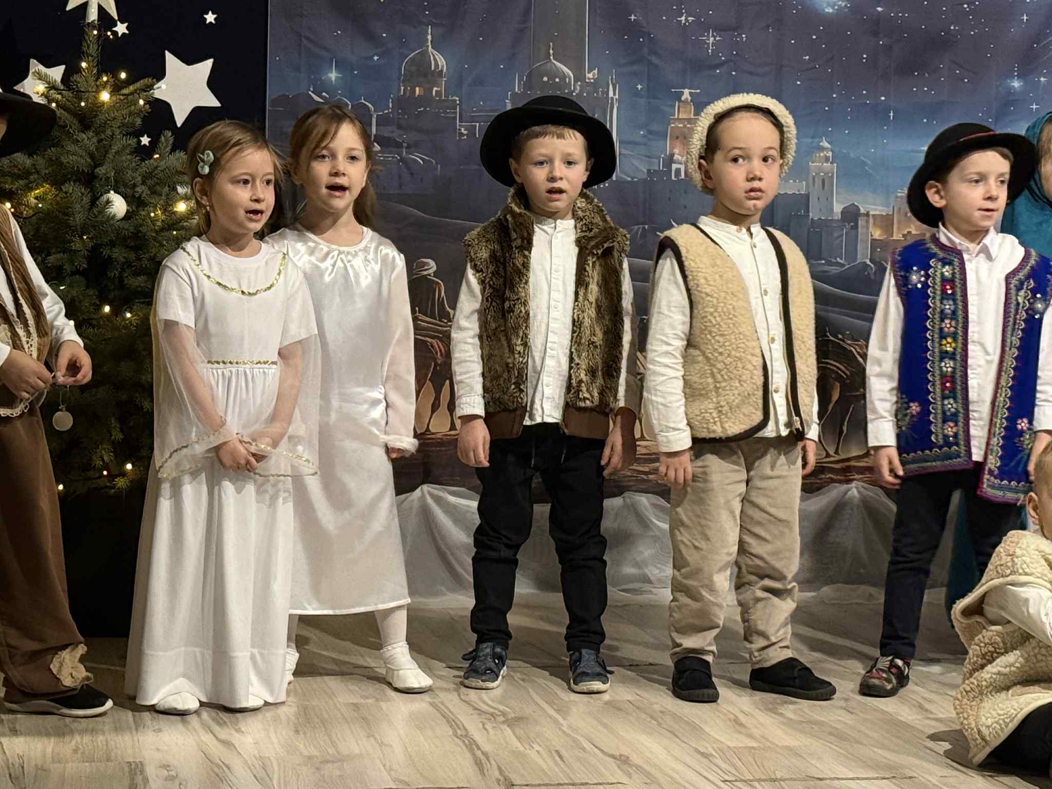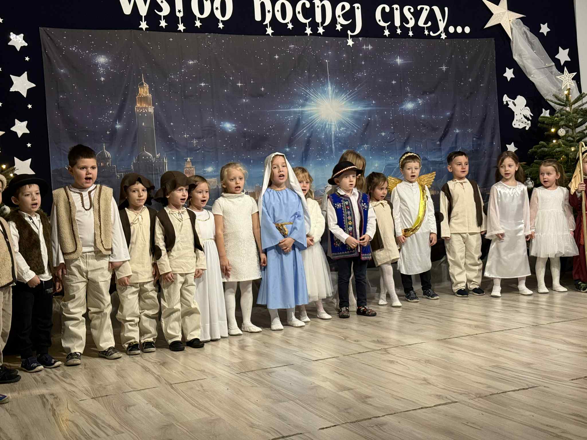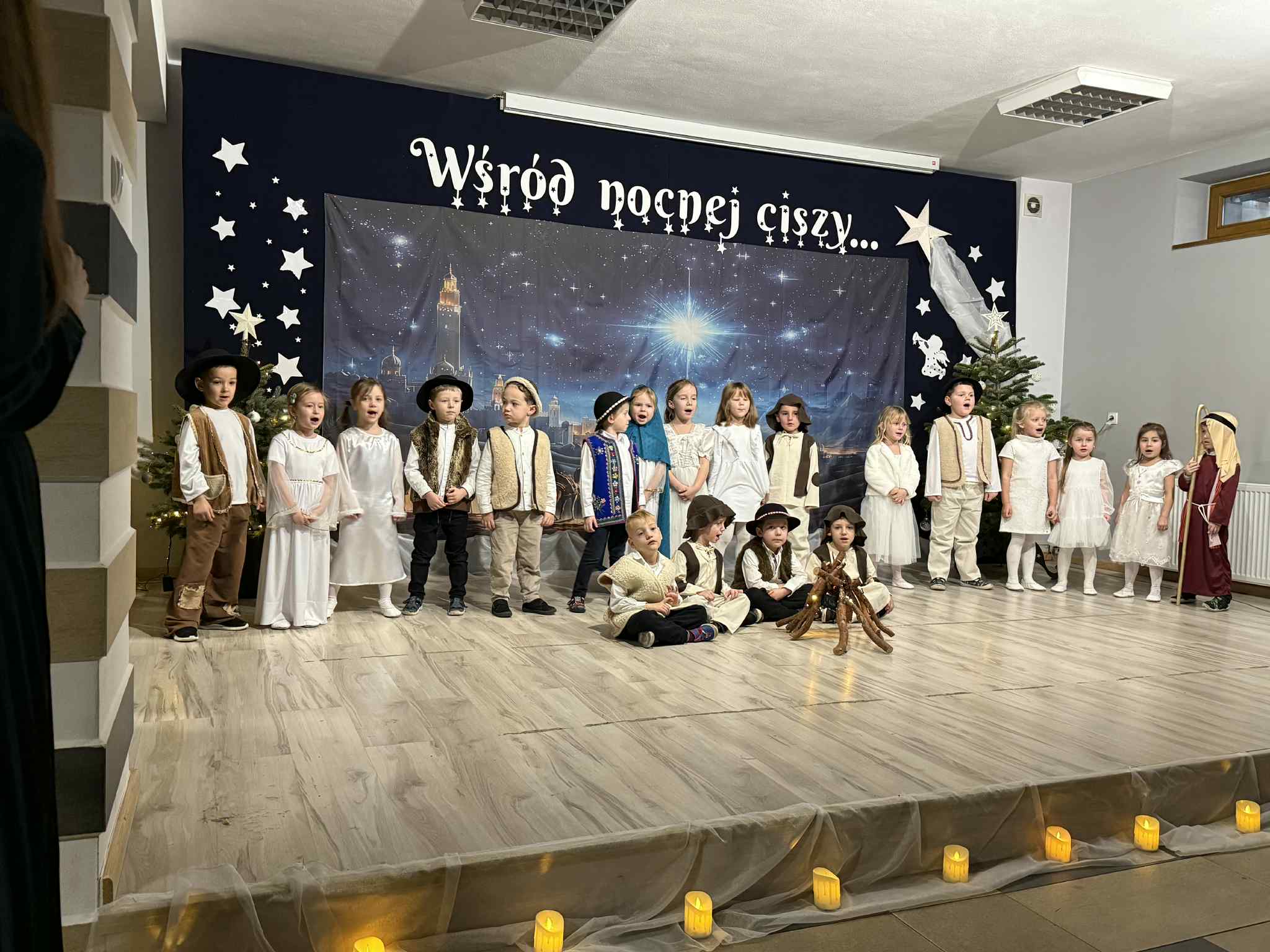 Przedstawienie przygotowały dzieci z grupy Pszczóki, które z ogromnym zaangażowaniem i untuzjazmem zaprezentowały historię narodzin Dzieciątka Jezus. Mali wcielili sie w rolę Maryi, Józefa, aniołów, pasterzy oraz Trzech Króli, zachwycając publiczność pięknymi strojami, śpiewem i odwagą sceniczną.