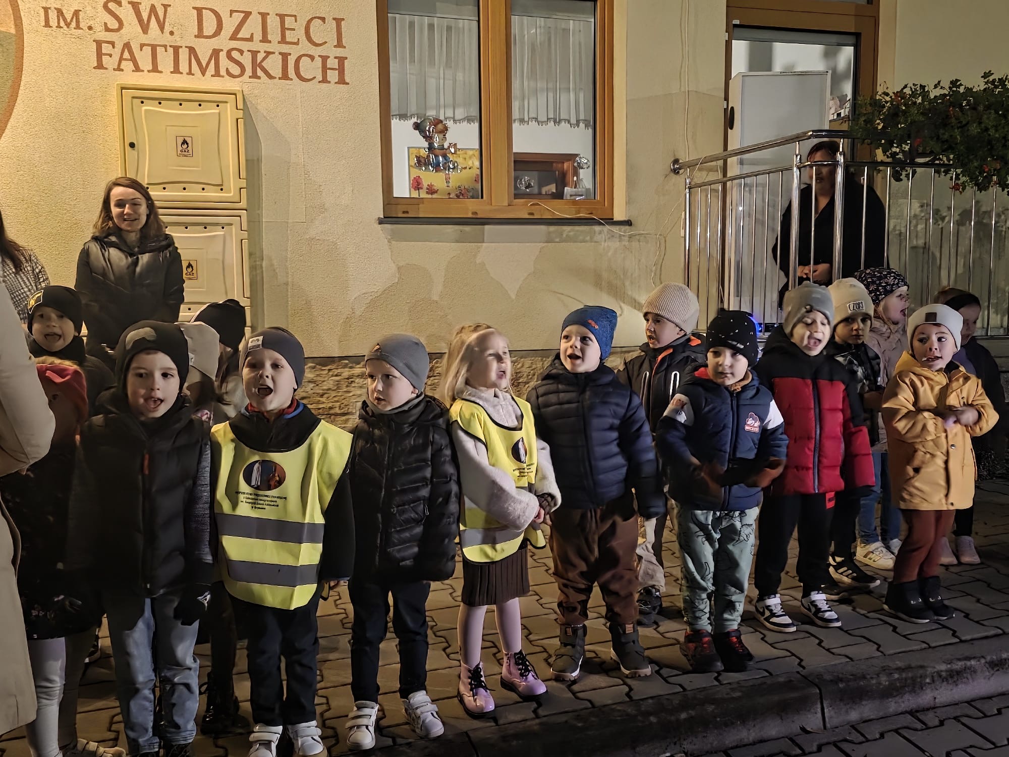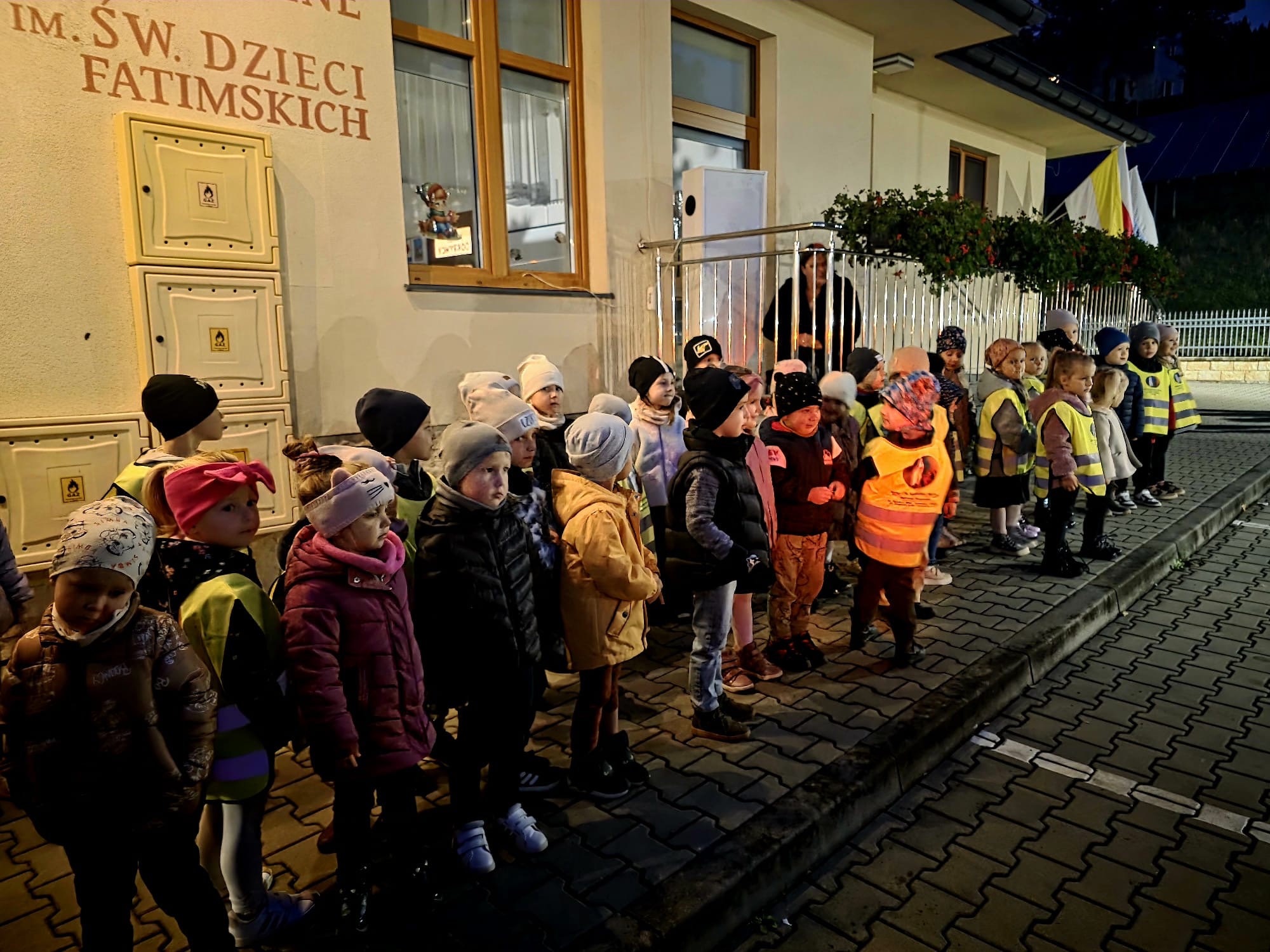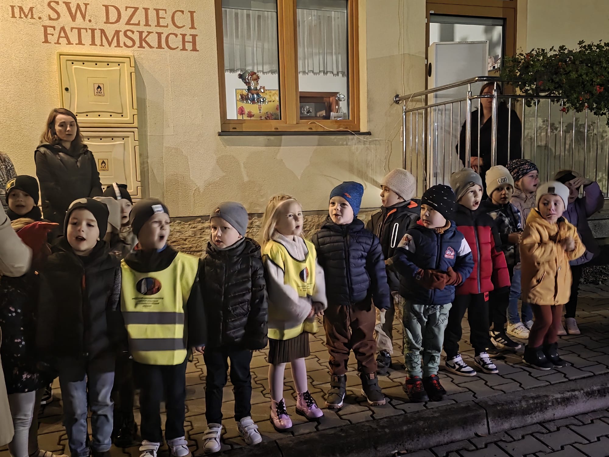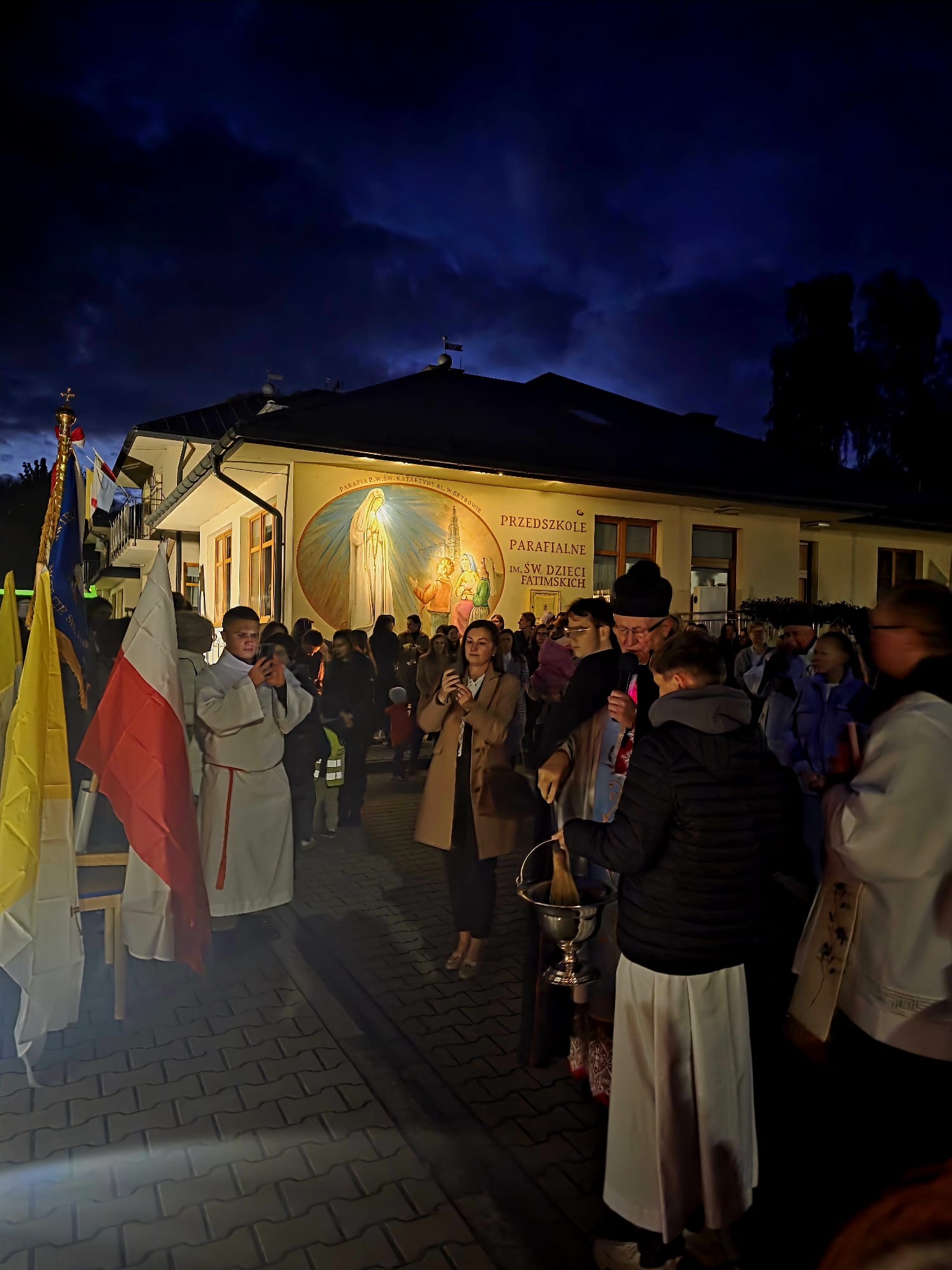 Po zakończonej Mszy Świętej wszyscy uczestnicy z różańcami w dłoni i modlitwą na ustach udali się w uroczystej procesji z kościoła na plac przy przedszkolu gdzie dzieci przygotowały krótki występ artystyczny i wspólnie odśpiewały Hymn Fatimski. Następnie Ks. Proboszcz dokonał poświęcenia figur i znajdującego się obok nowego placu zabaw. Wspólnie modliliśmy się za dzieci uczęszczające do przedszkola oraz całą społeczność lokalną związaną z naszą placówką.