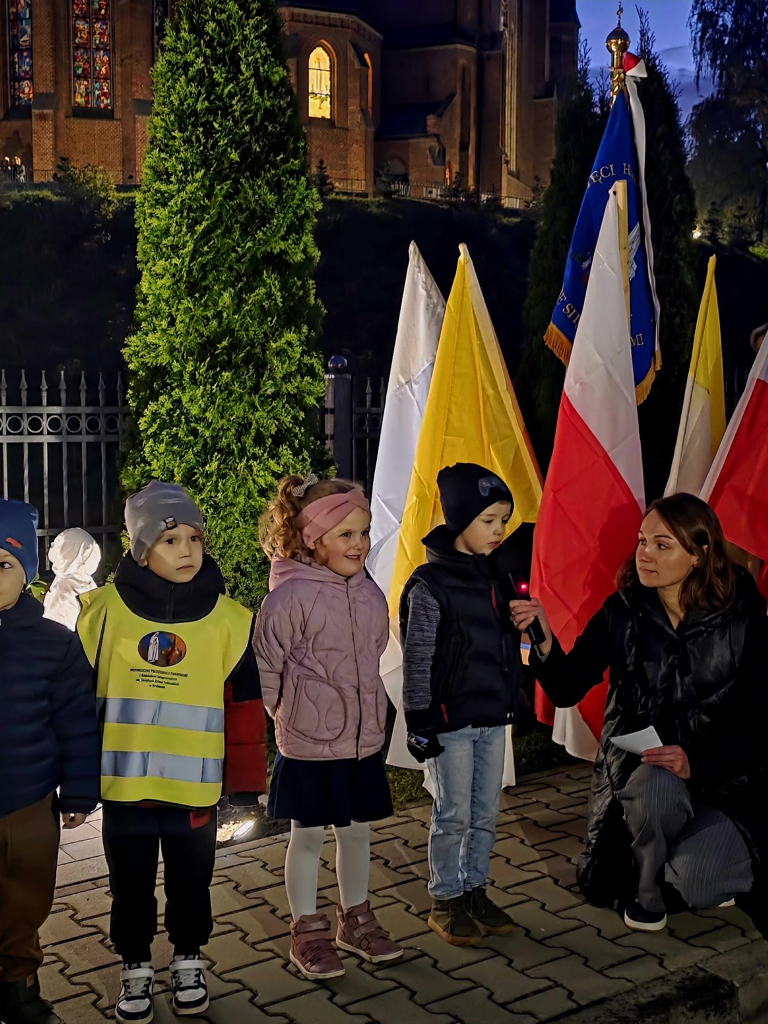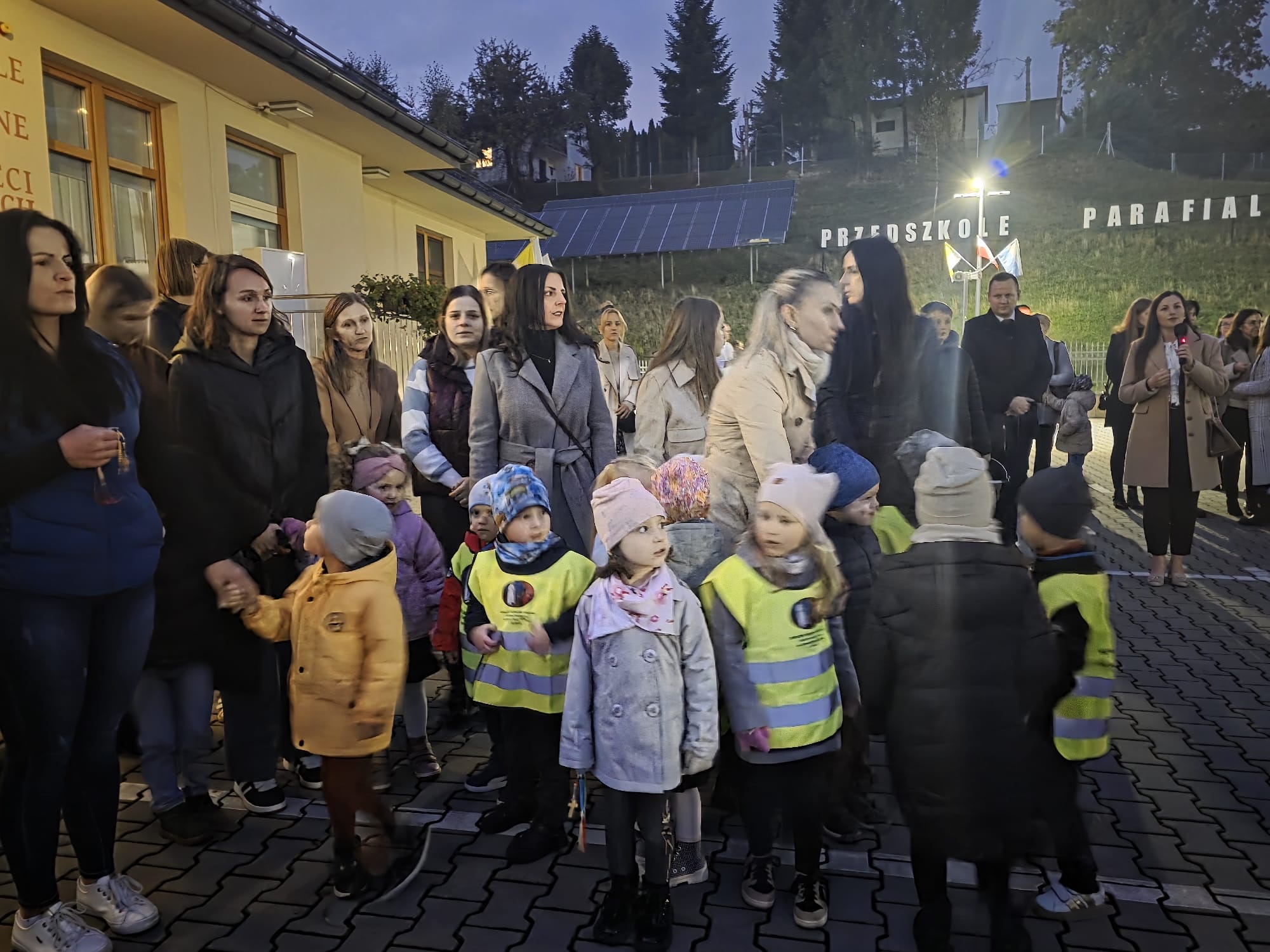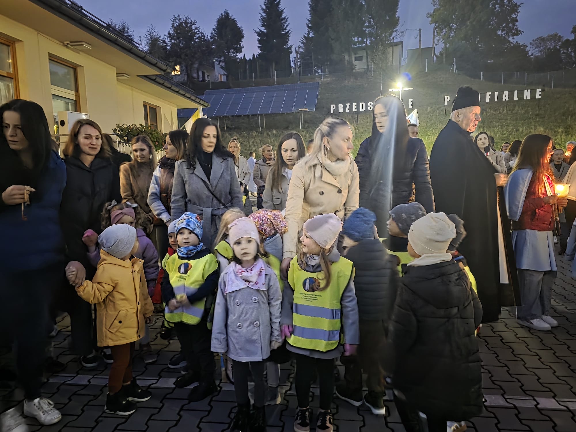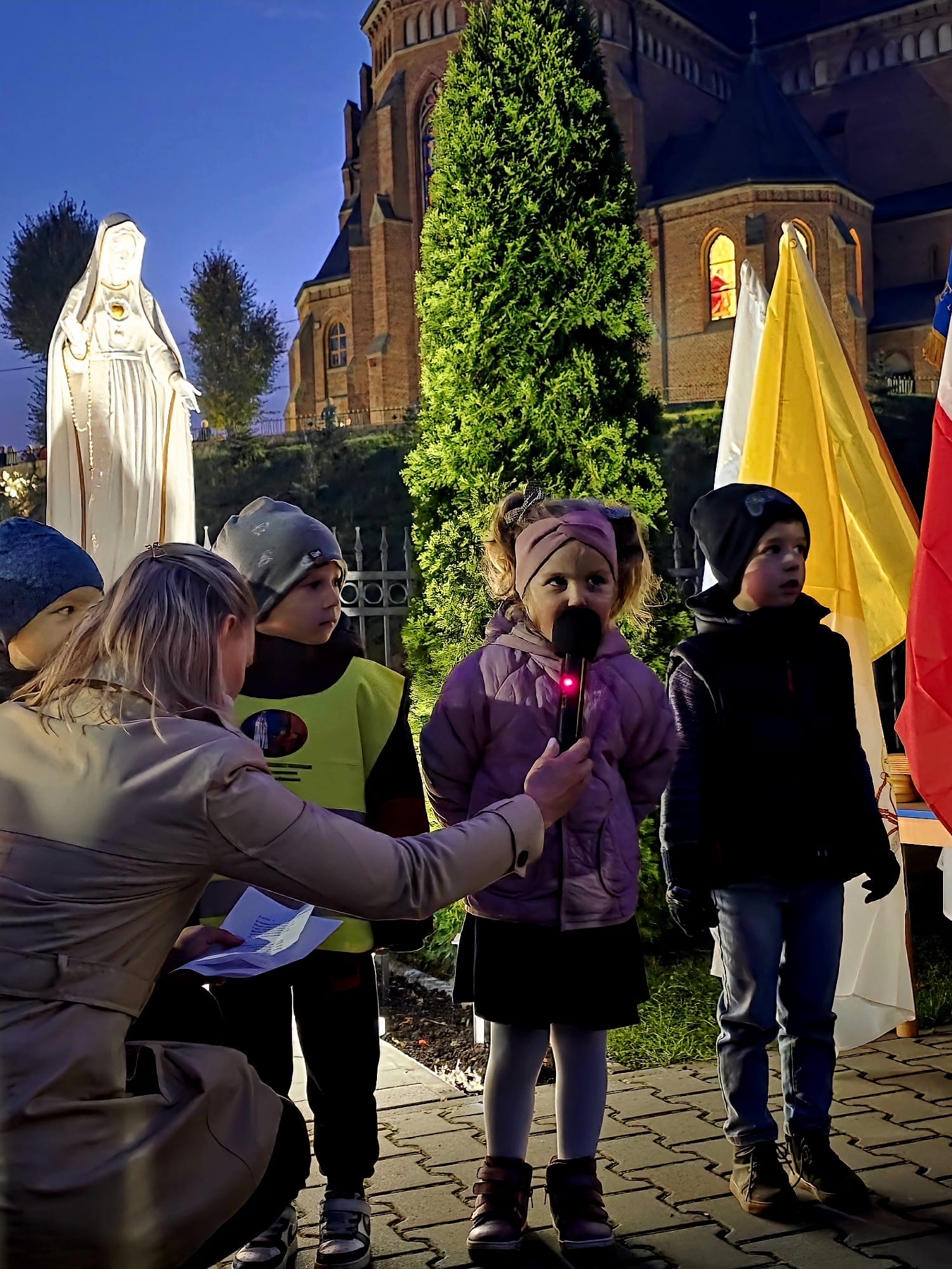 Po zakończonej Mszy Świętej wszyscy uczestnicy z różańcami w dłoni i modlitwą na ustach udali się w uroczystej procesji z kościoła na plac przy przedszkolu gdzie dzieci przygotowały krótki występ artystyczny i wspólnie odśpiewały Hymn Fatimski. Następnie Ks. Proboszcz dokonał poświęcenia figur i znajdującego się obok nowego placu zabaw. Wspólnie modliliśmy się za dzieci uczęszczające do przedszkola oraz całą społeczność lokalną związaną z naszą placówką.