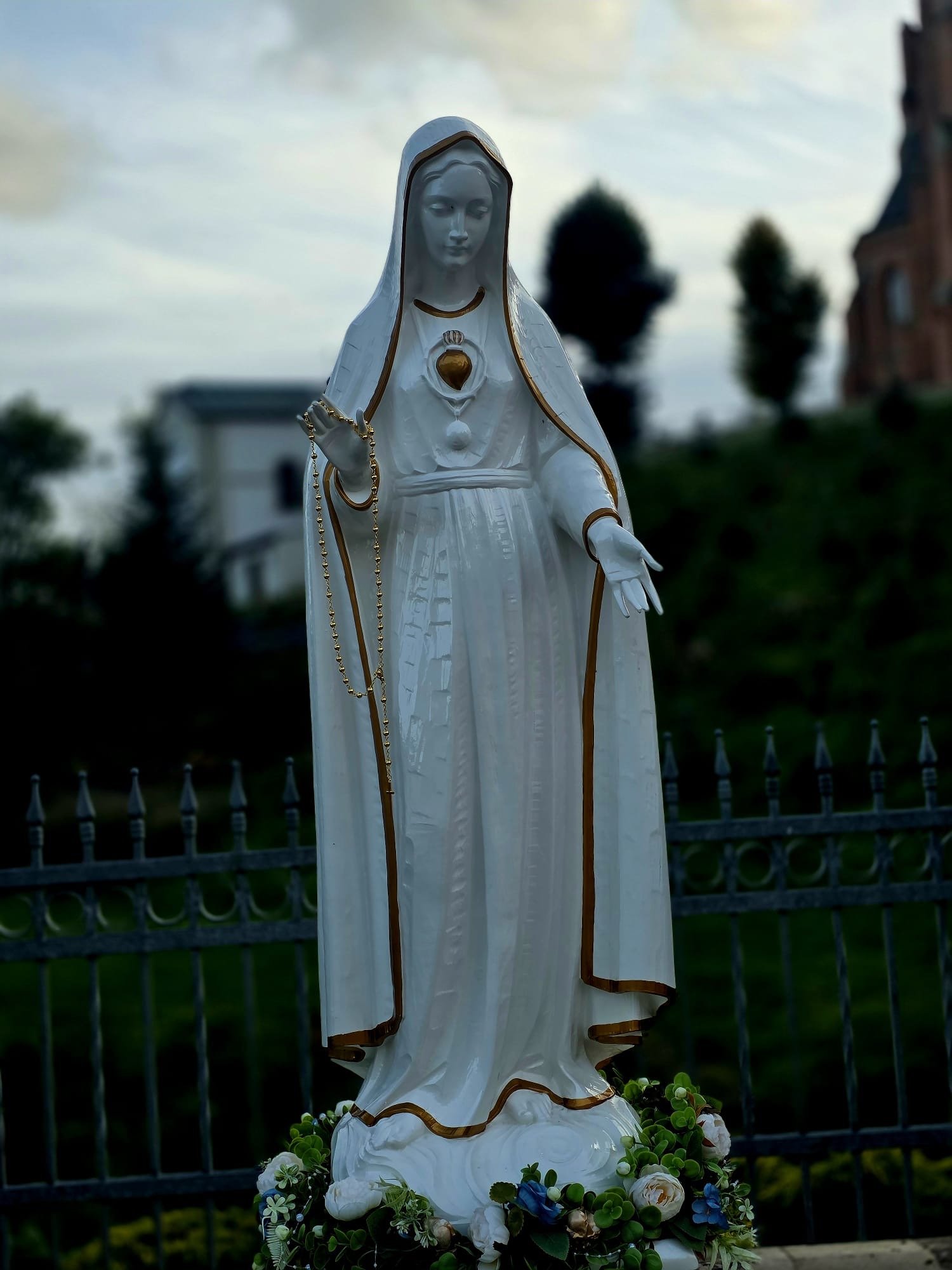 Figura Maryi w kolorystyce biało-perłowej ze zdobieniami złotymi ma wysokość 120 cm. Przedstawia ona Matkę Bożą w geście szeroko otwartych ramion z różańcem w ręku skierowanych ku stojących przed nią dzieci tj. Franciszka, Łucji i Hiacynty. Otwarte dłonie i ramiona Maryi symbolizują Jej pragnienie zaproszenia wszystkich do całkowitego zawierzenia i posłuszeństwa Panu Bogu. Różaniec, który trzyma w dłoniach zachęca do podjęcia modlitwy na różańcu o pokój na świecie. Na piersiach Maryi zarysowane na złoty kolor jest wyraźnie Niepokalane Serce Matki Bożej wzywające do modlitwy, pokuty i nawrócenia. Maryja patrzy ciepłym wzrokiem i łagodnym wyrazem twarzy na stojące przed nią dzieci oraz wszystkich którzy zatrzymują się na chwilę modlitwy przed Matką Bożą Fatimską.