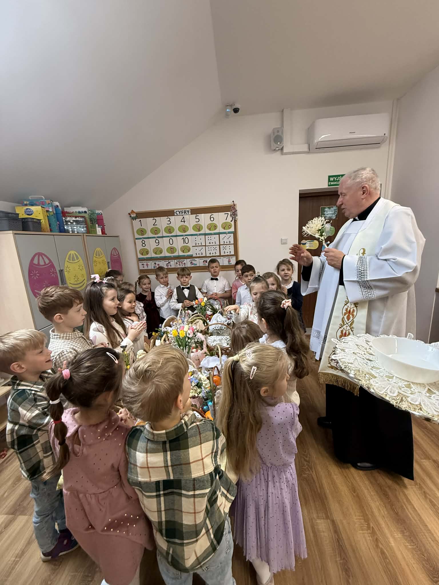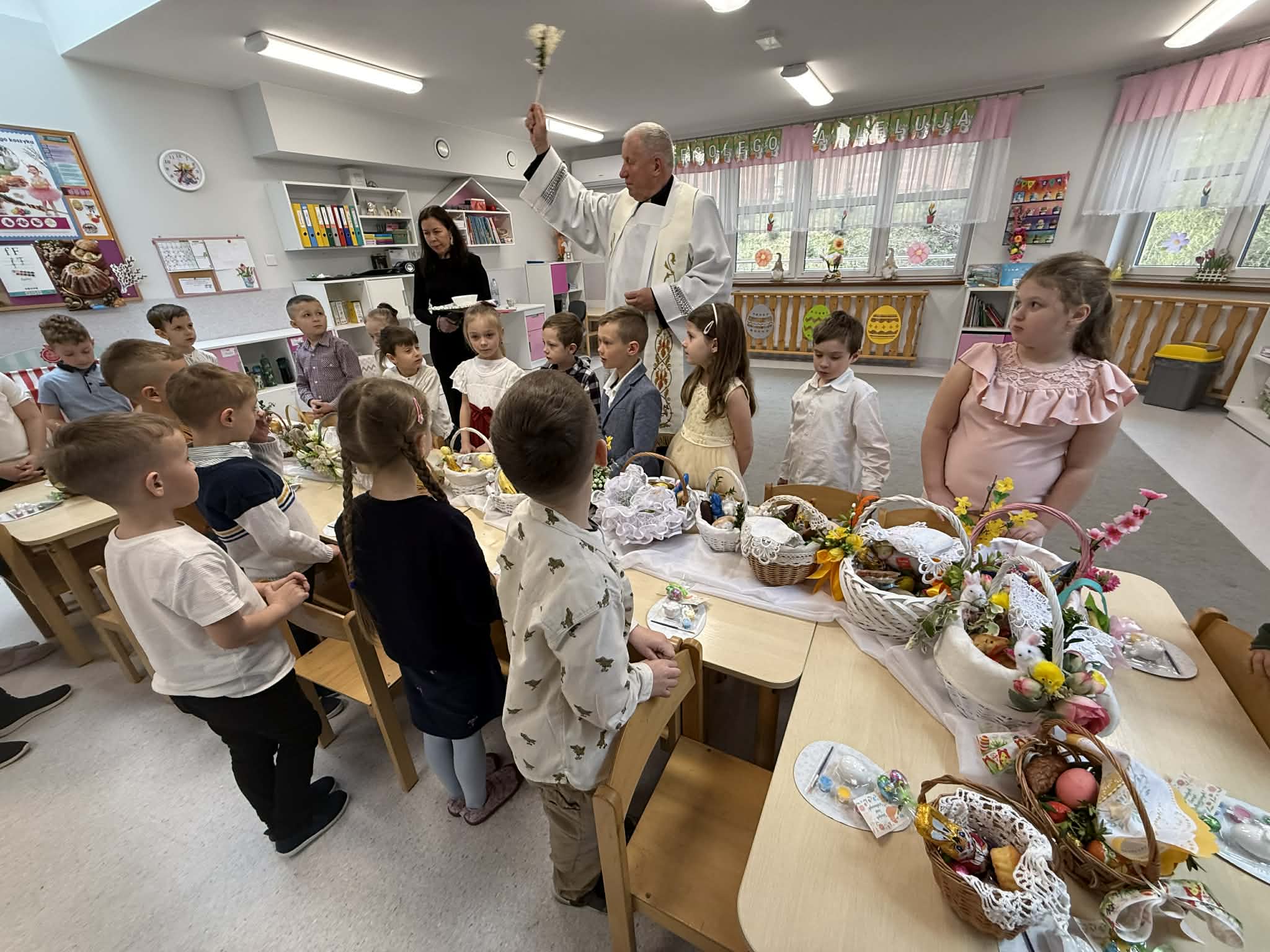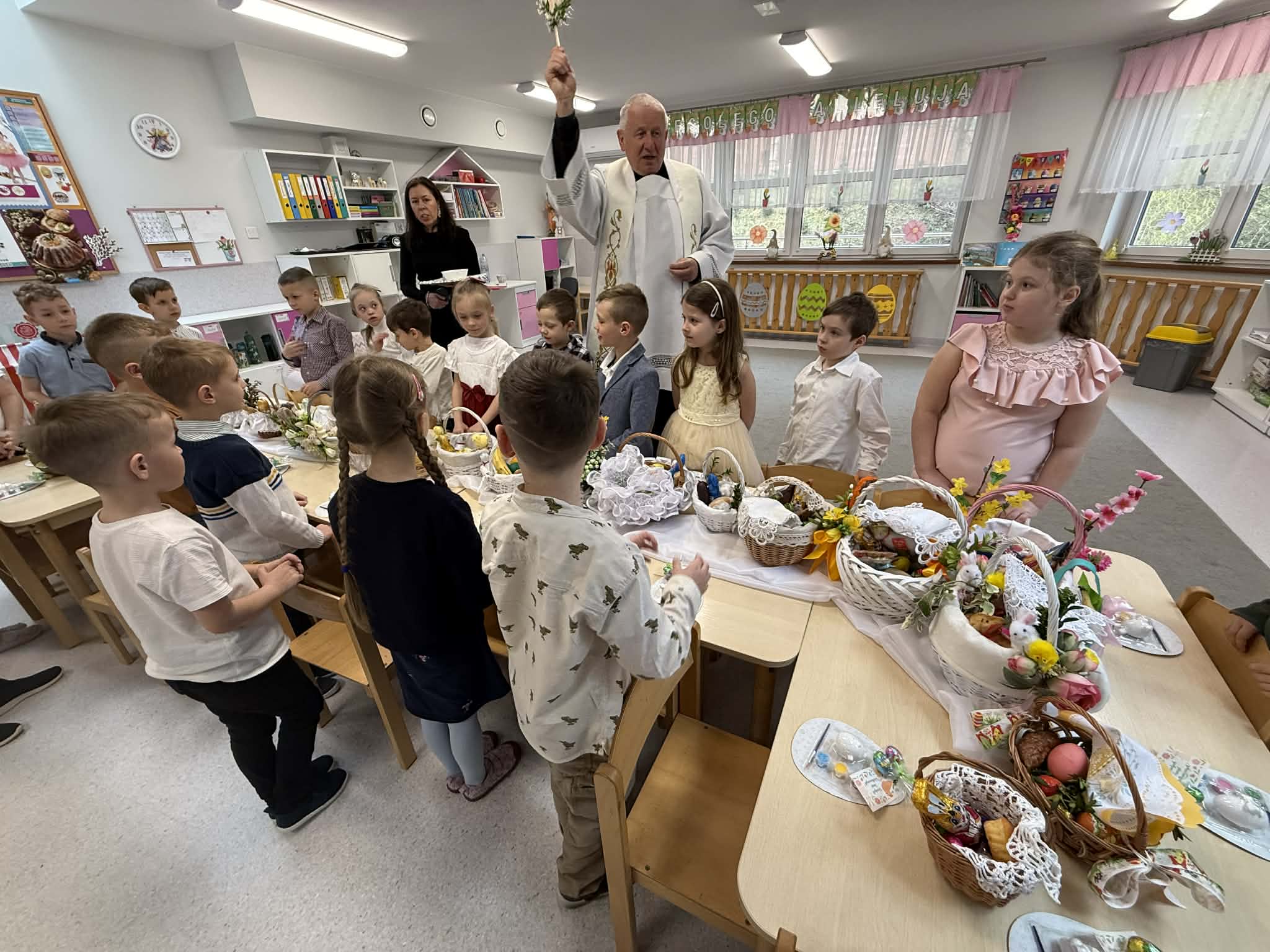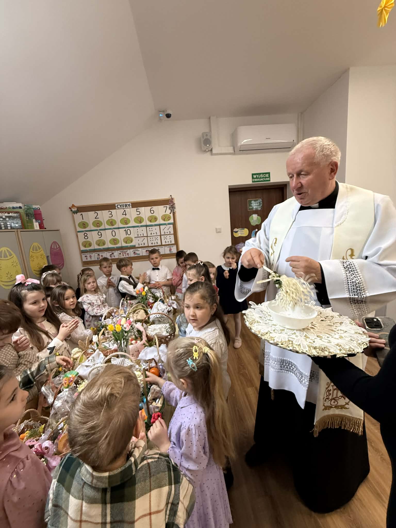Uroczystości przewodniczył ks. Proboszcz Ryszard Sorota, który wspólnie z dziećmi i wychowawcami modlił się, wprowadzając wszystkich w głębokie przeżywanie tajemnicy Zmartwychwstania Pańskiego. Następnie dokonał poświęcenia pokarmów, które dzieci z radością zabrały do swoich domów.