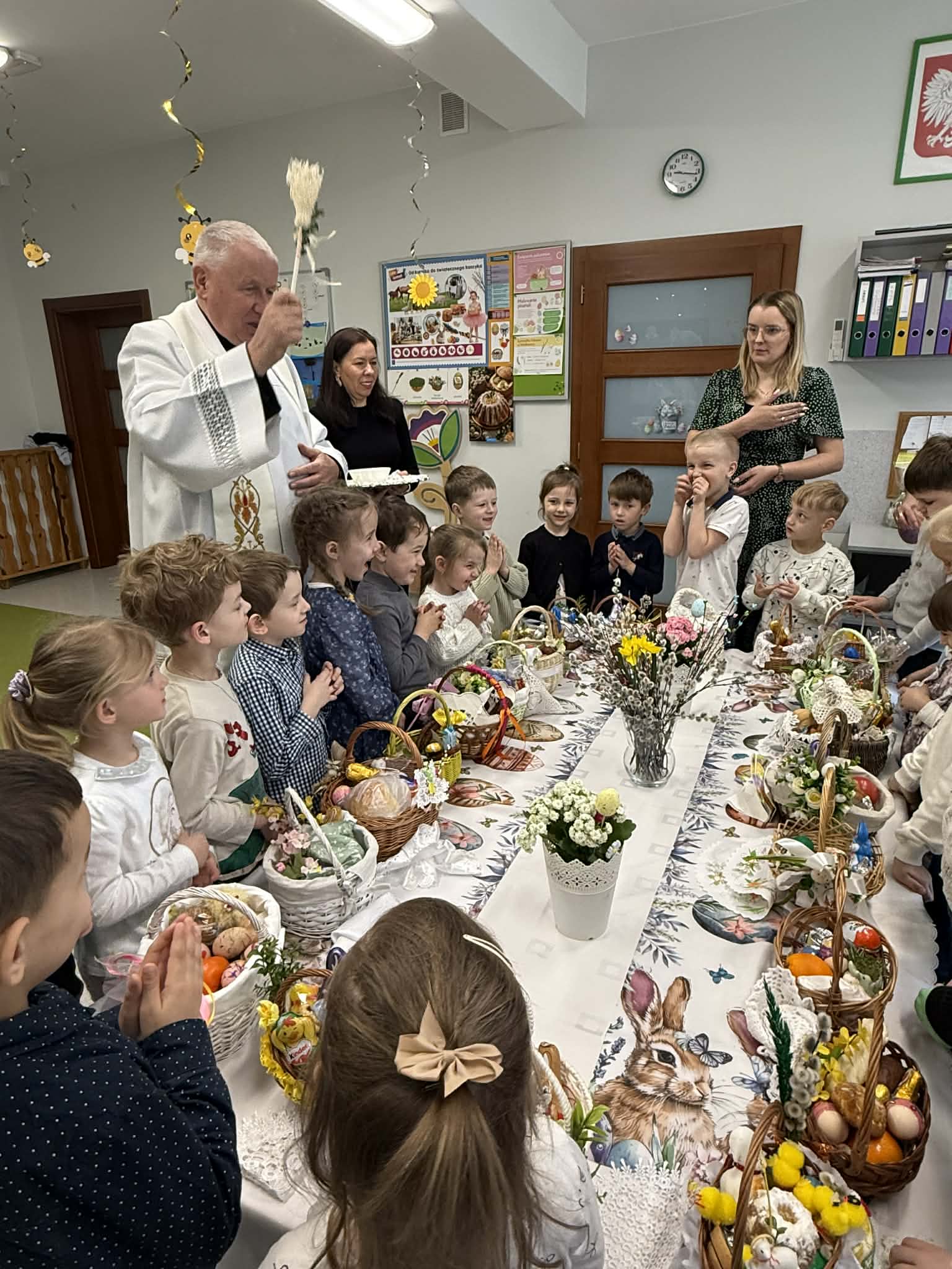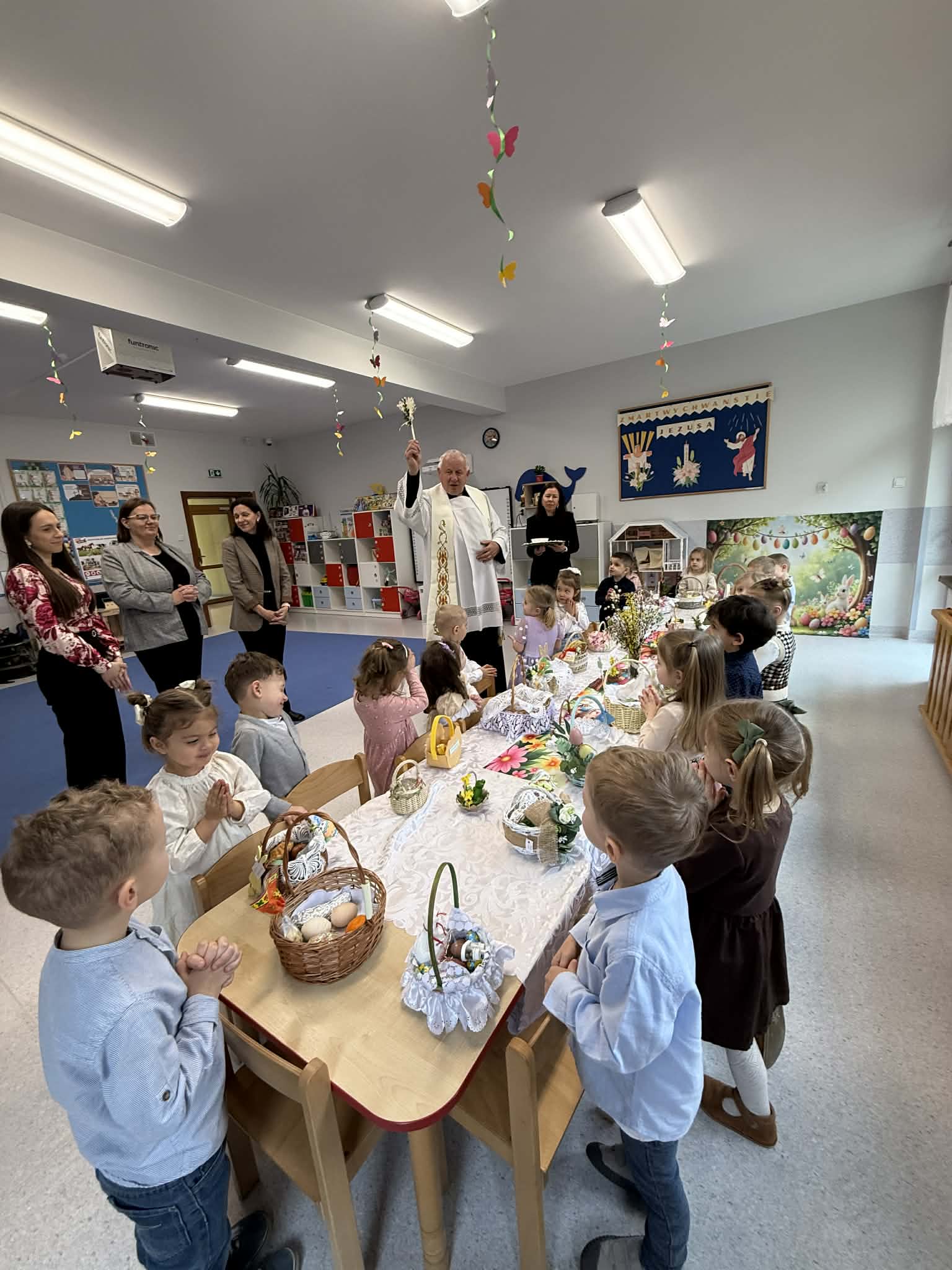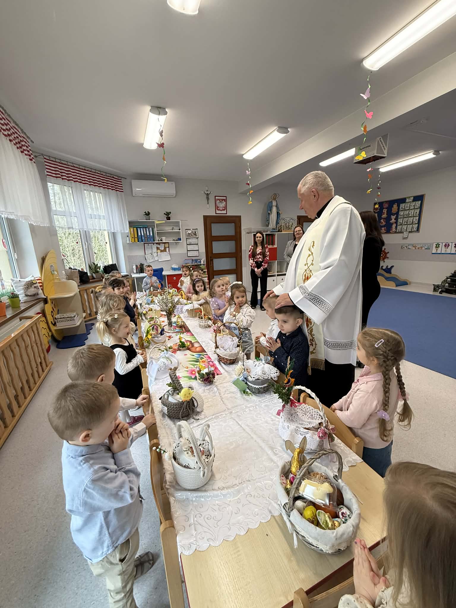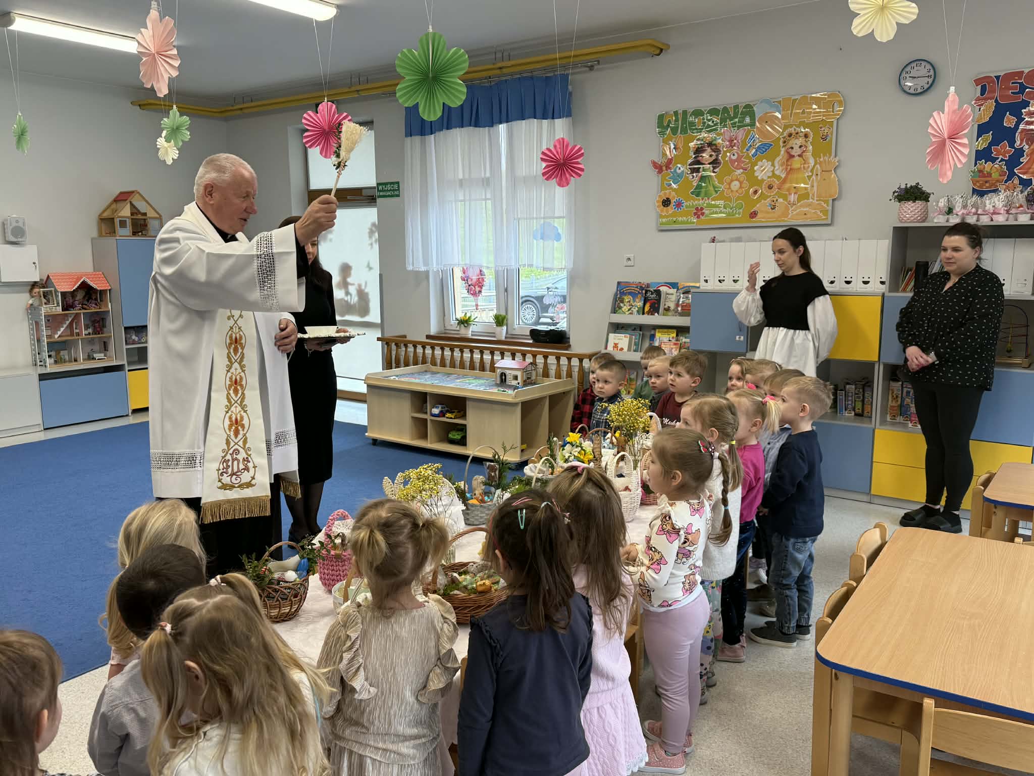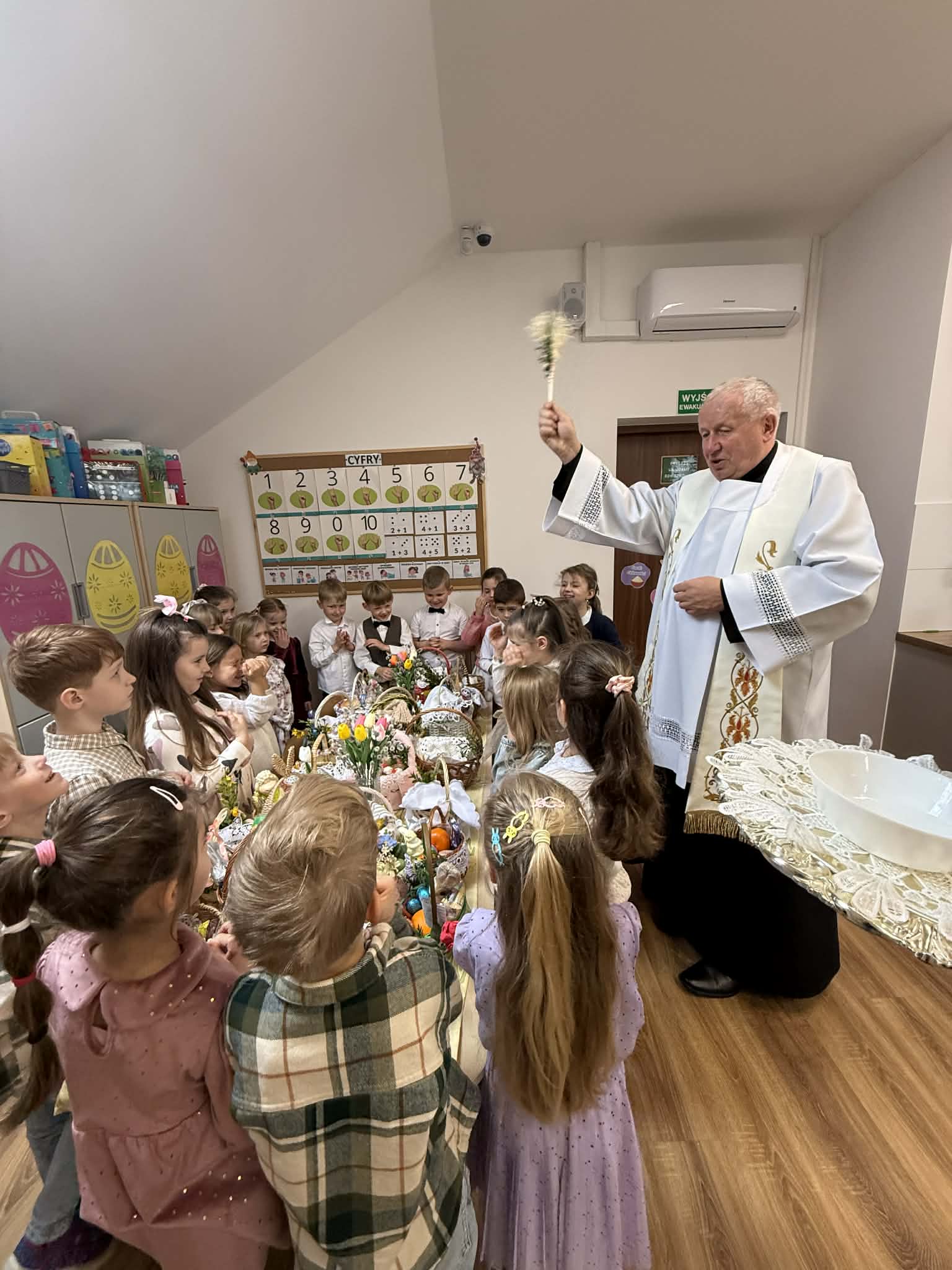 Uroczystości przewodniczył ks. Proboszcz Ryszard Sorota, który wspólnie z dziećmi i wychowawcami modlił się, wprowadzając wszystkich w głębokie przeżywanie tajemnicy Zmartwychwstania Pańskiego. Następnie dokonał poświęcenia pokarmów, które dzieci z radością zabrały do swoich domów.