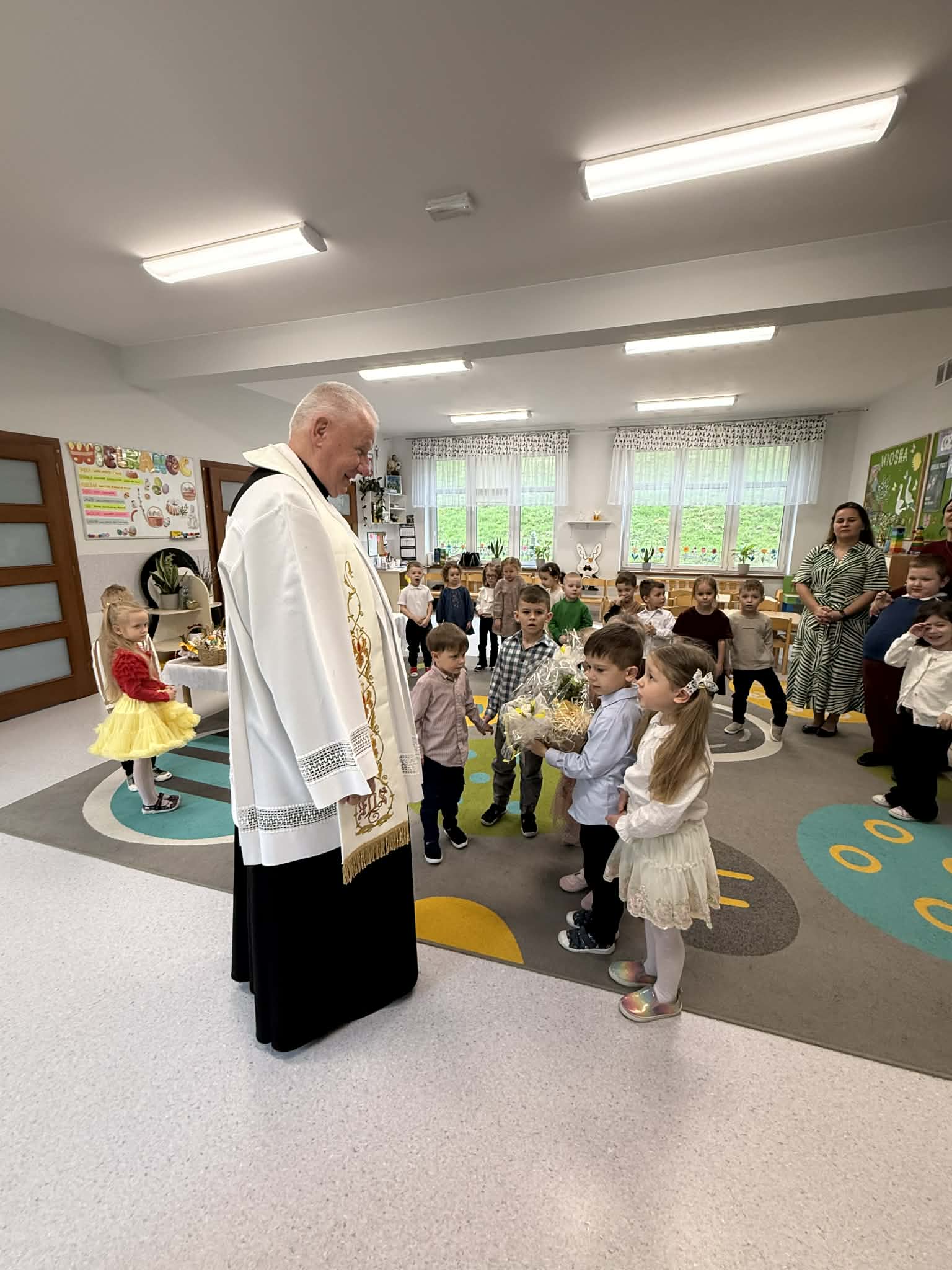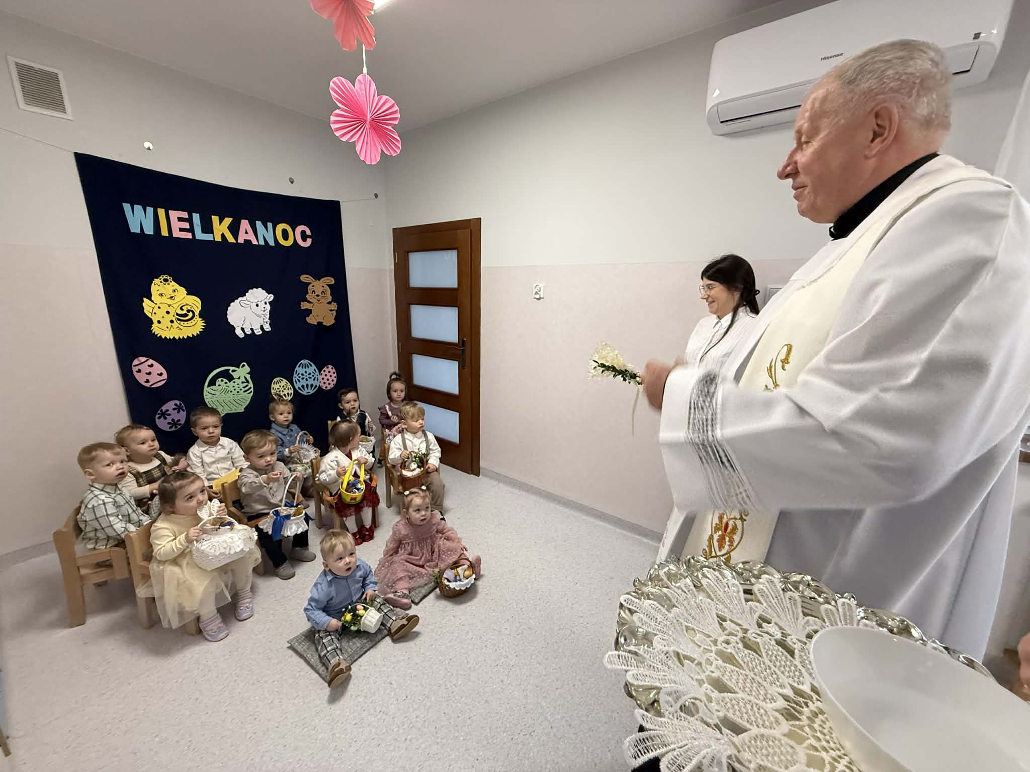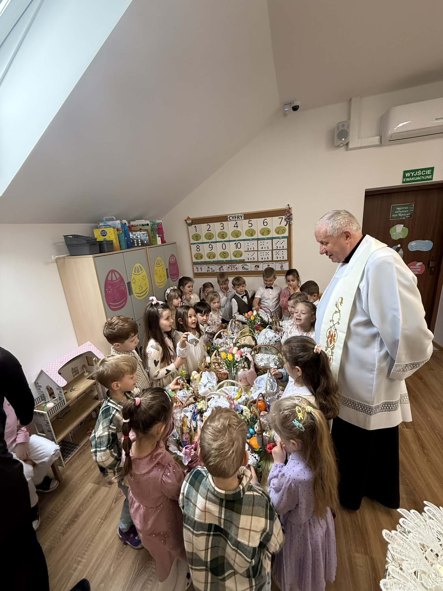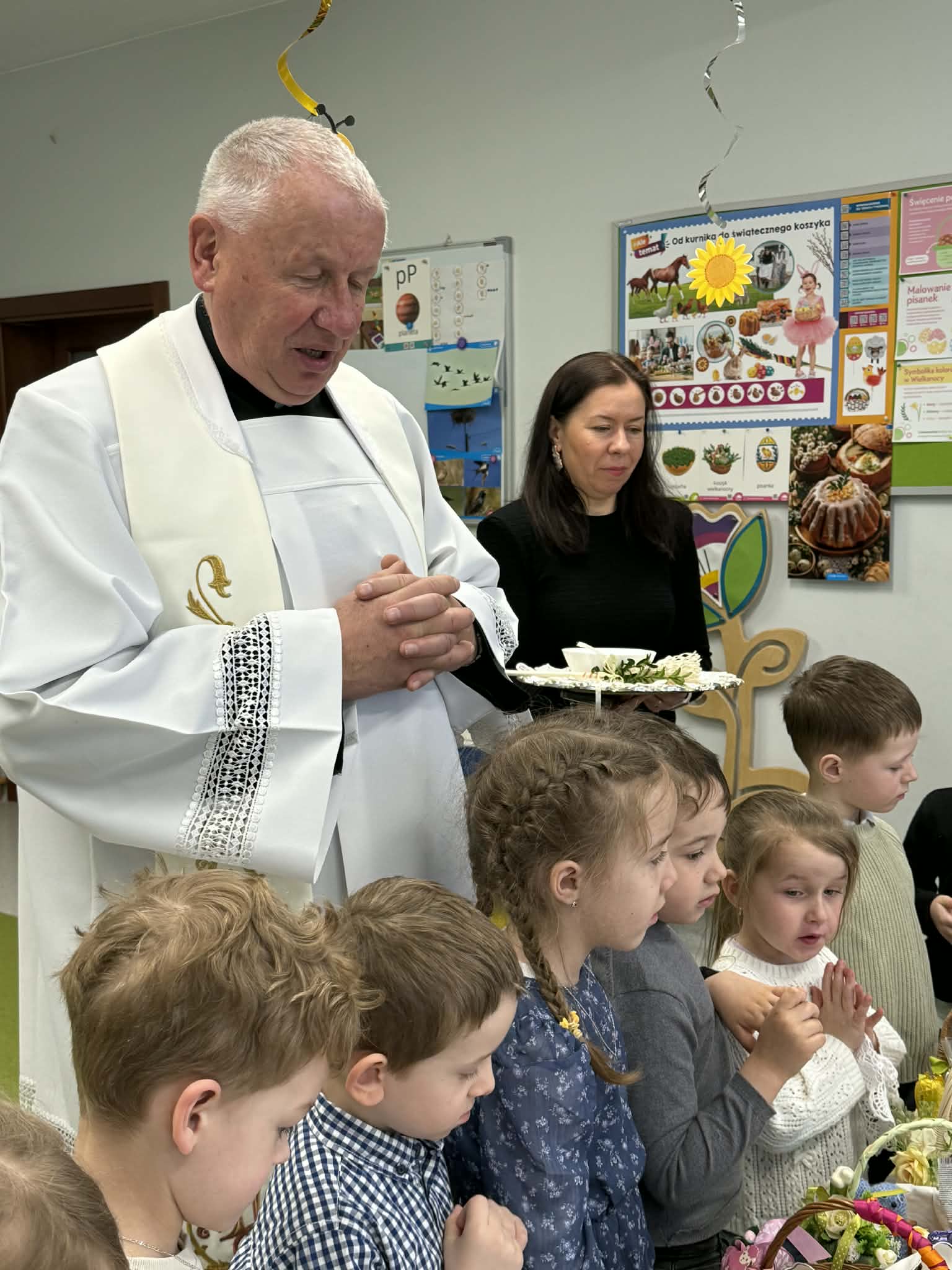 Uroczystości przewodniczył ks. Proboszcz Ryszard Sorota, który wspólnie z dziećmi i wychowawcami modlił się, wprowadzając wszystkich w głębokie przeżywanie tajemnicy Zmartwychwstania Pańskiego. Następnie dokonał poświęcenia pokarmów, które dzieci z radością zabrały do swoich domów.