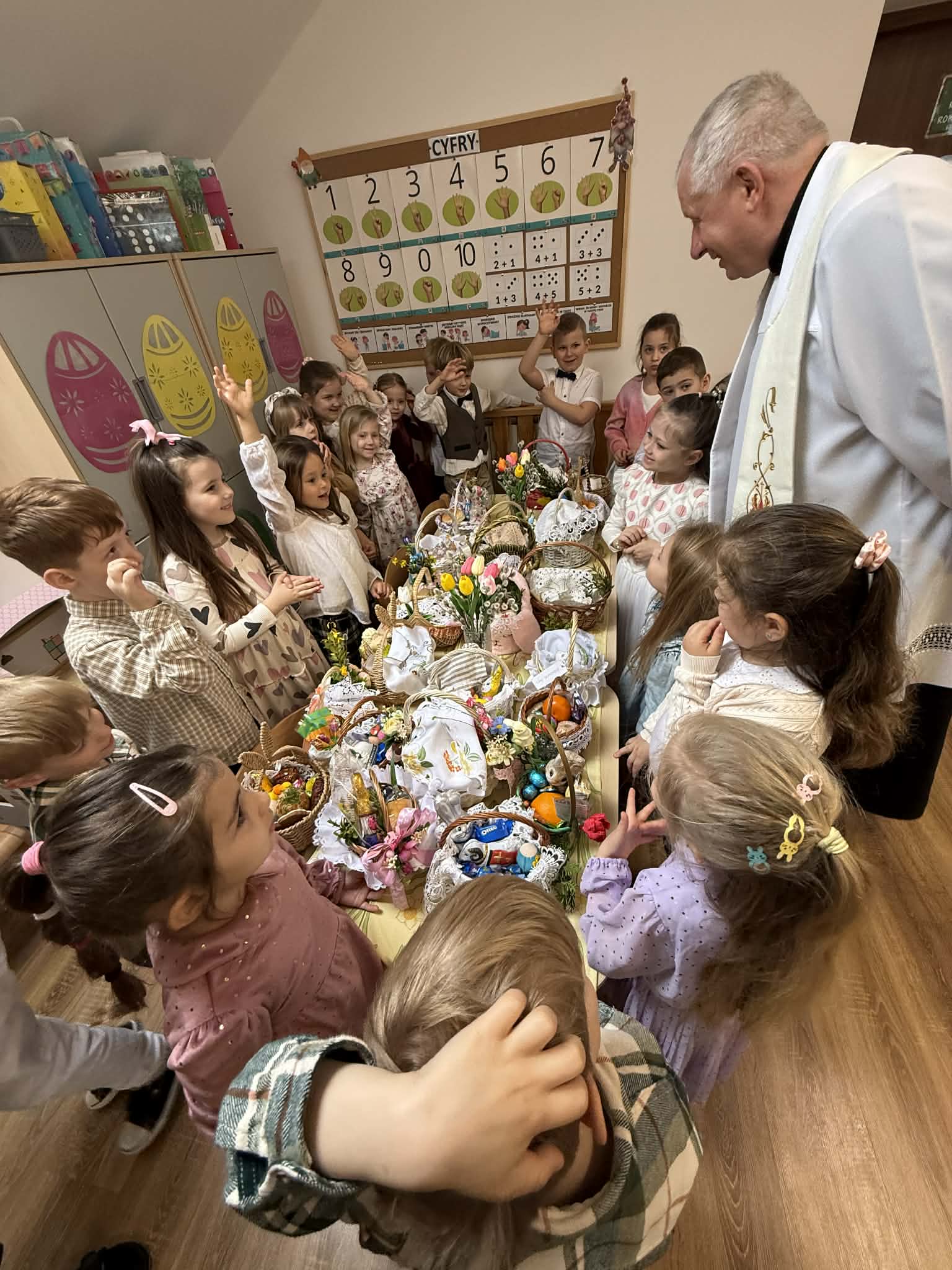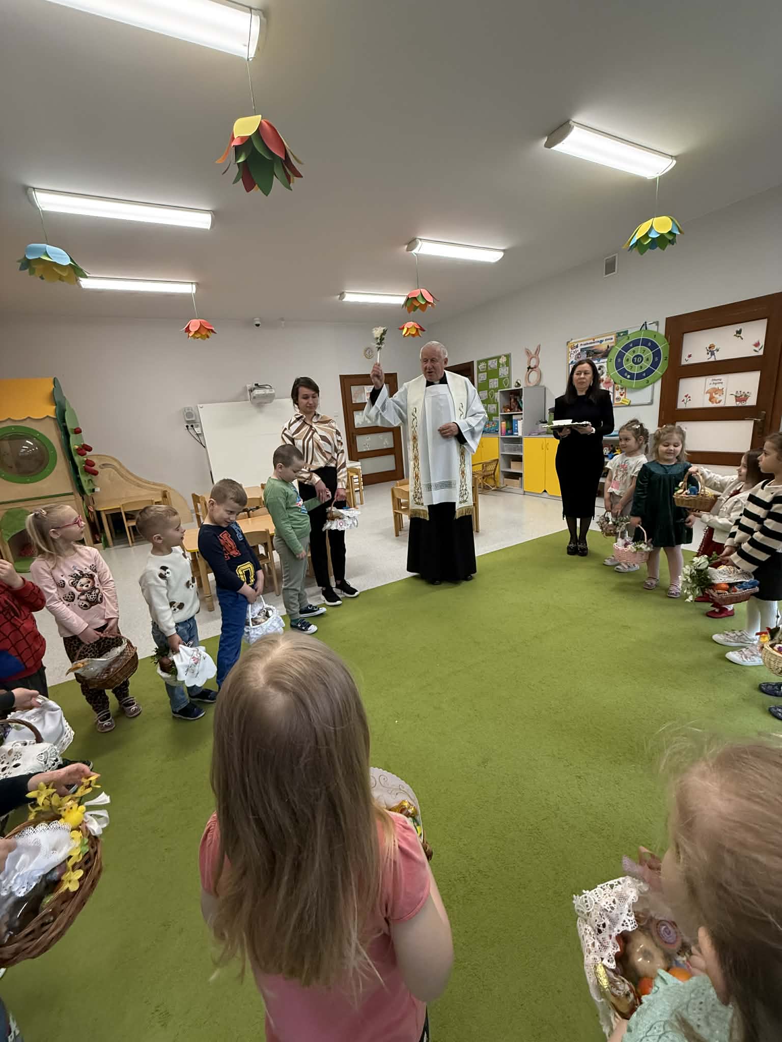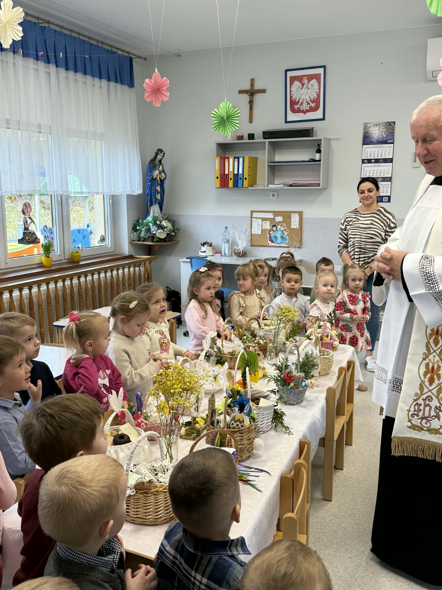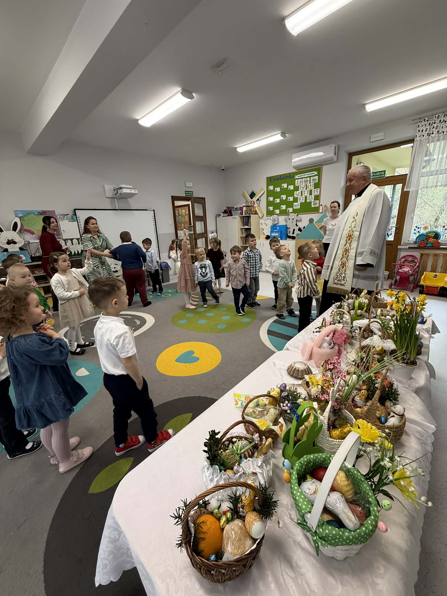 W atmosferze radości i przygotowań do nadchodzących Świąt Wielkanocnych w naszym przedszkolu parafialnym odbyło się uroczyste poświęcenie koszyczków z pokarmami. Dzieci, ubrane odświętnie, przyniosły pięknie przygotowane koszyczki wielkanocne. Nie zabrakło w nich tradycyjnych pokarmów, takich jak jajka, chleb, kiełbasa czy baranek - symbolizujących życie, dostatek i zwycięstwo Chrystusa nad śmiercią.
