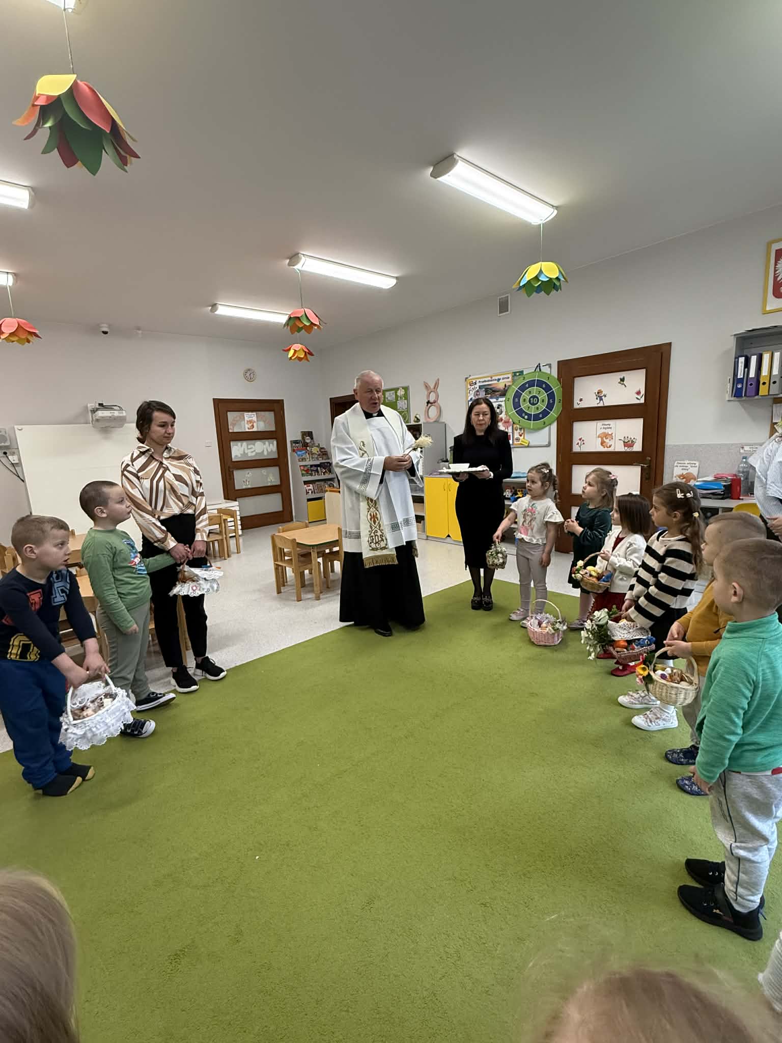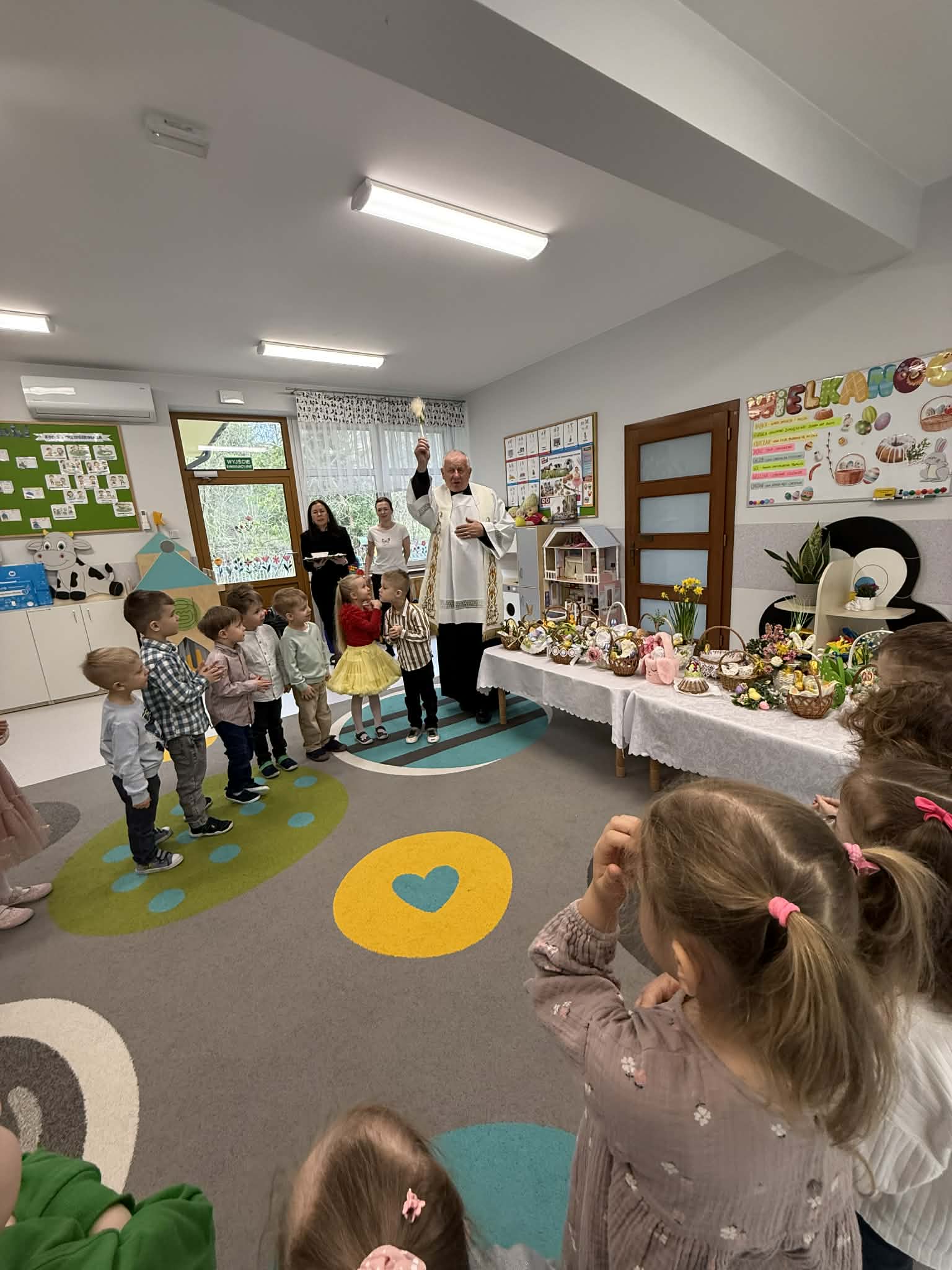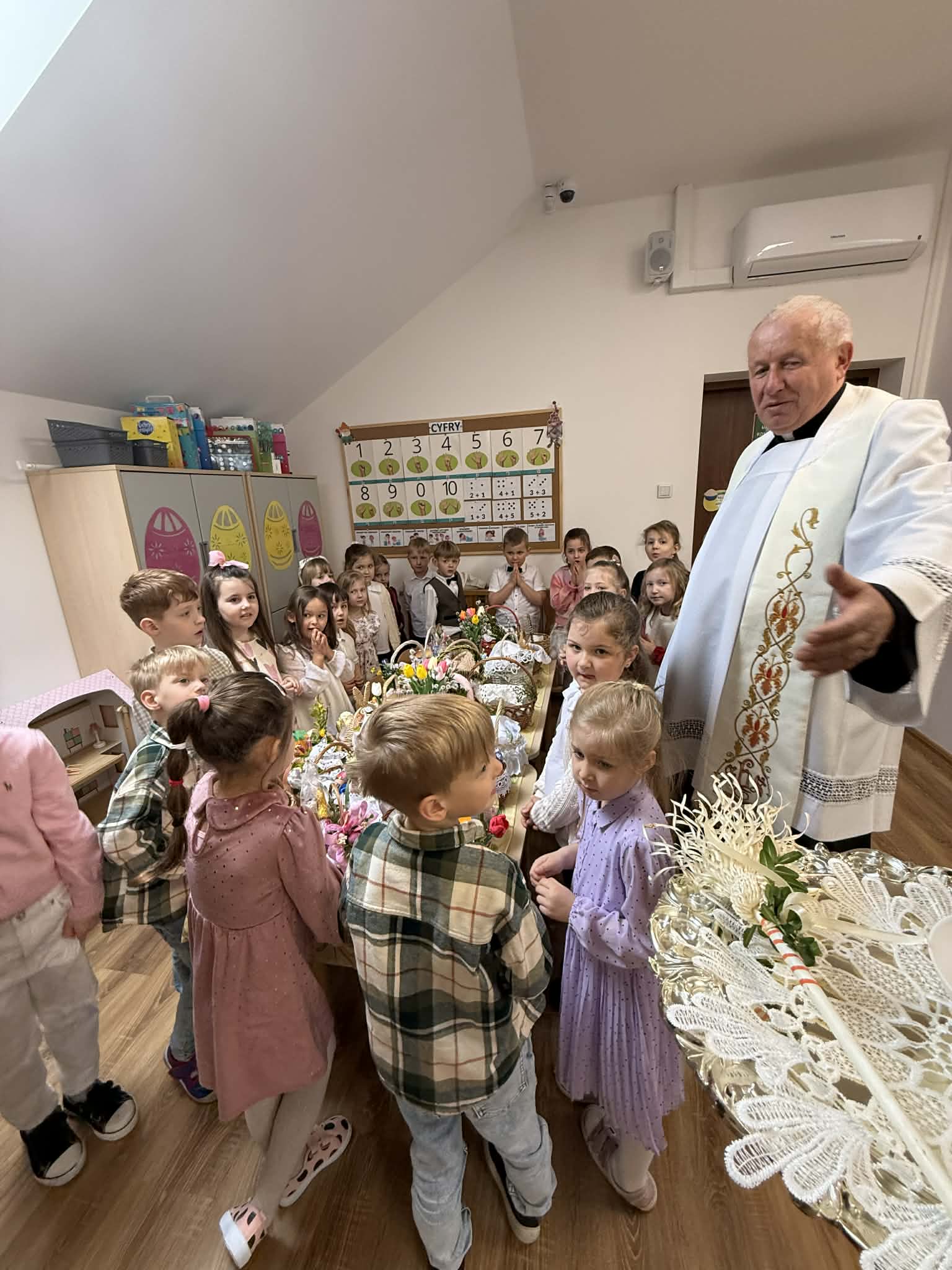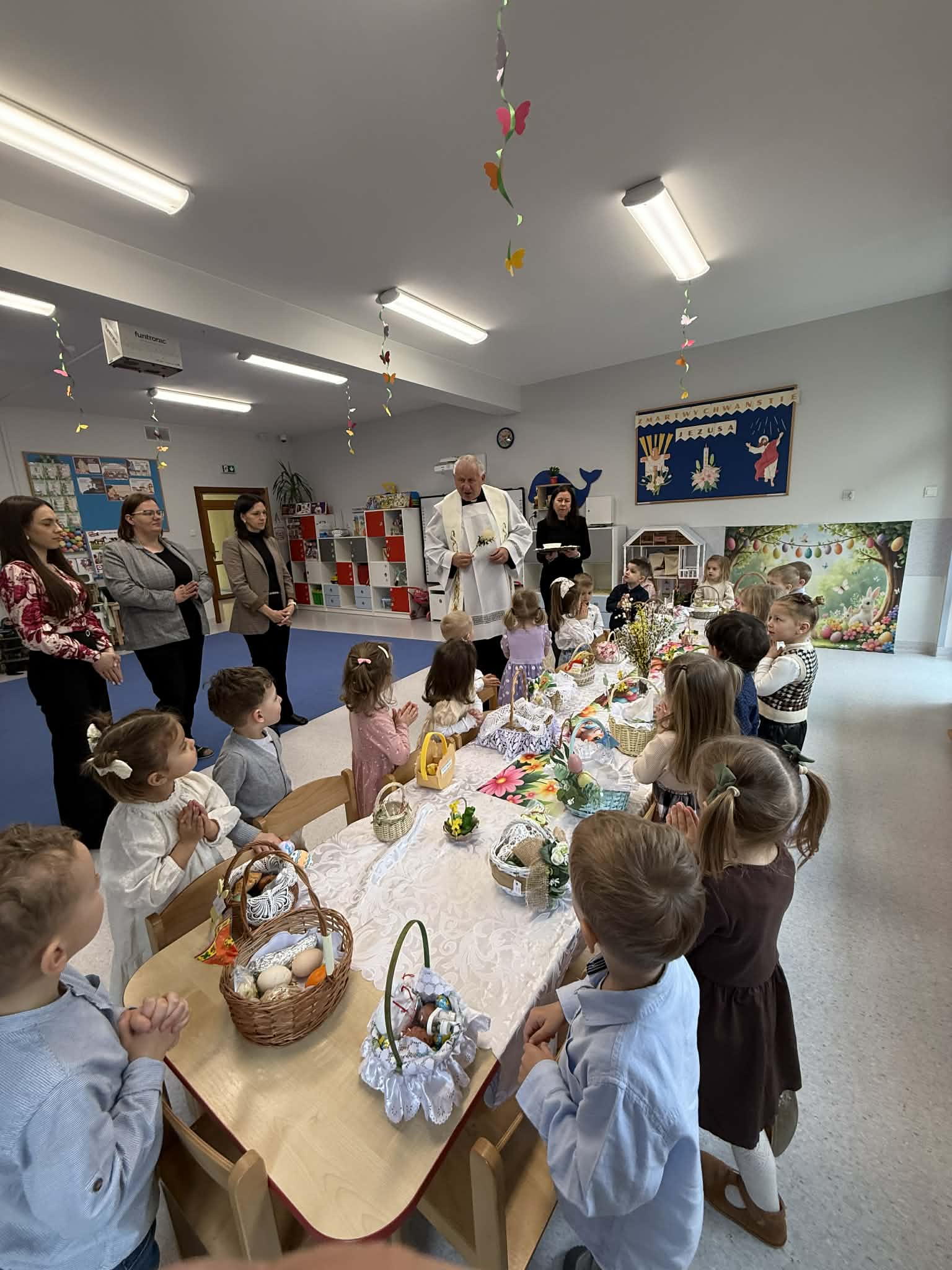 W atmosferze radości i przygotowań do nadchodzących Świąt Wielkanocnych w naszym przedszkolu parafialnym odbyło się uroczyste poświęcenie koszyczków z pokarmami. Dzieci, ubrane odświętnie, przyniosły pięknie przygotowane koszyczki wielkanocne. Nie zabrakło w nich tradycyjnych pokarmów, takich jak jajka, chleb, kiełbasa czy baranek - symbolizujących życie, dostatek i zwycięstwo Chrystusa nad śmiercią.
