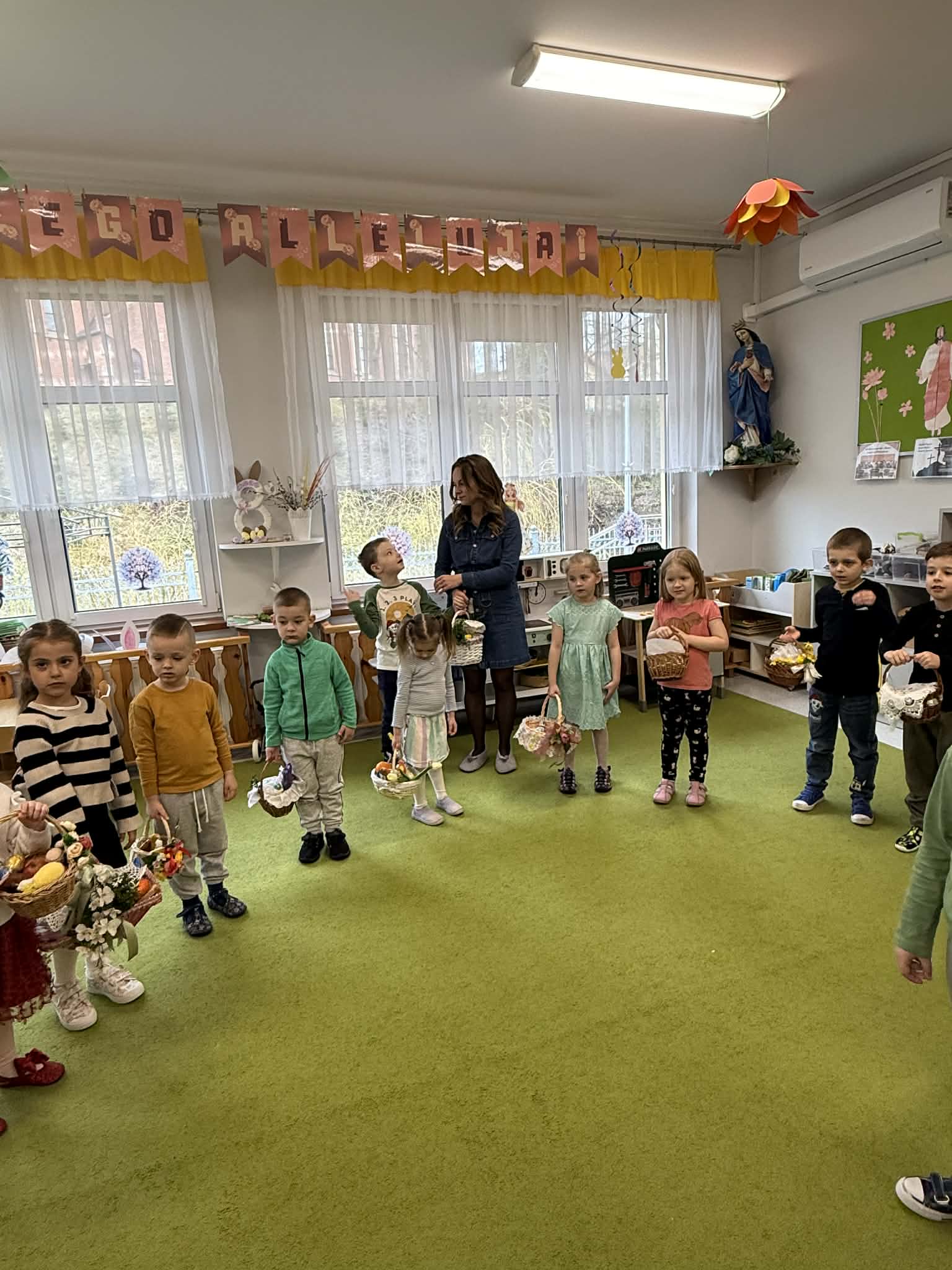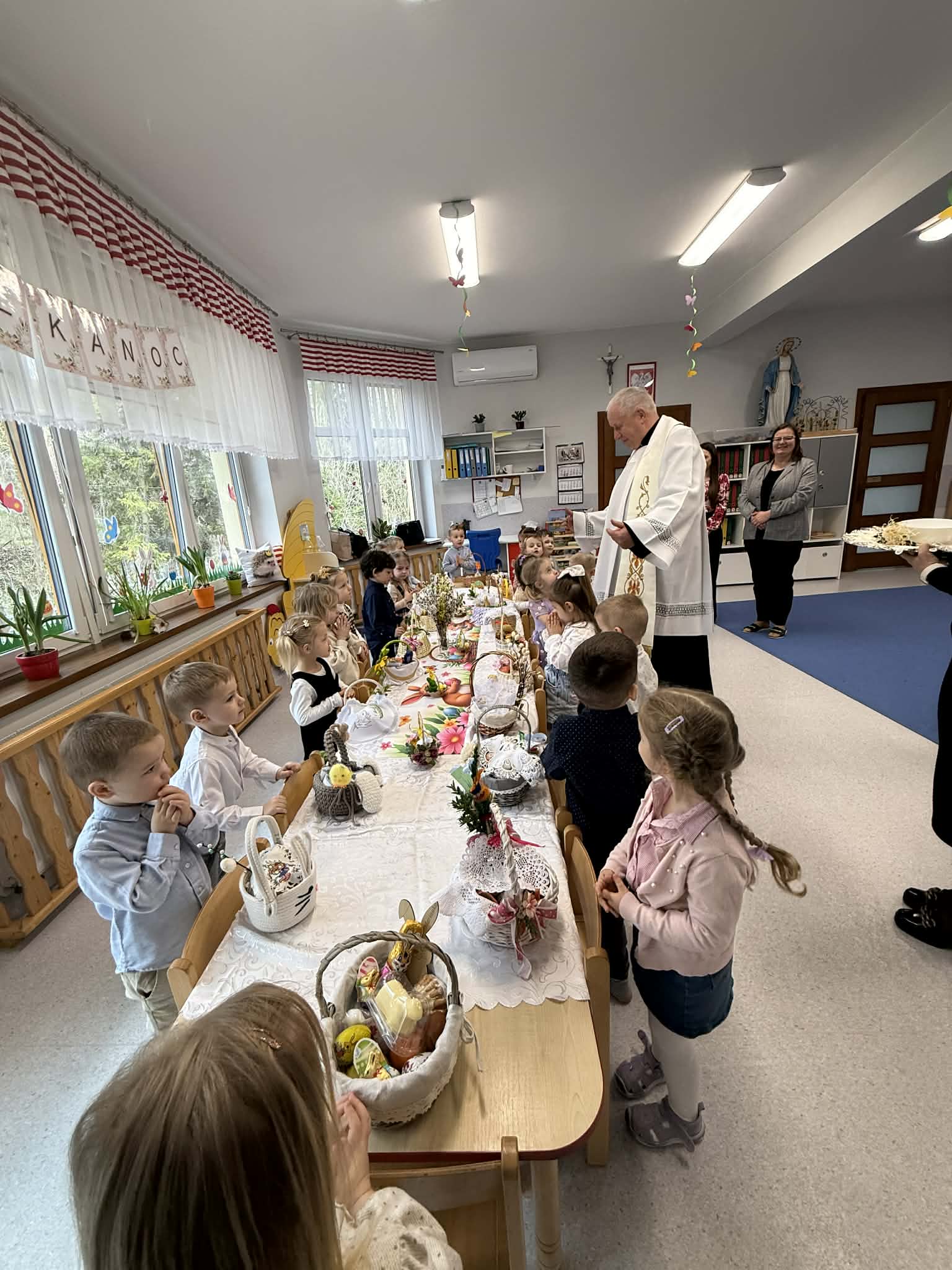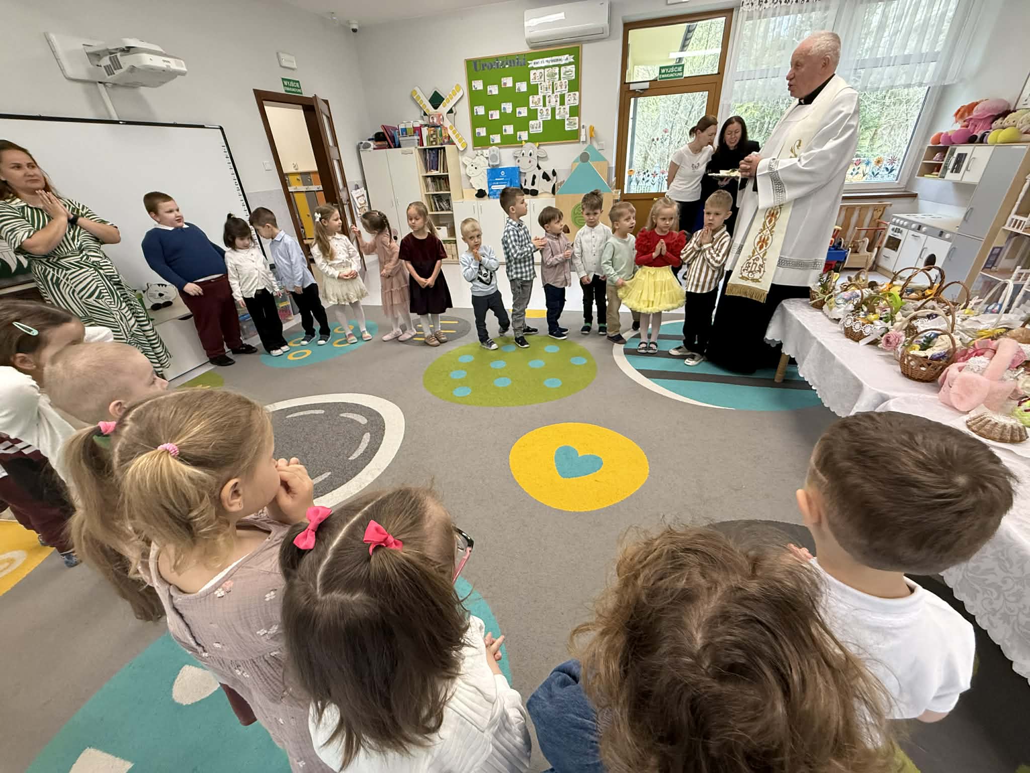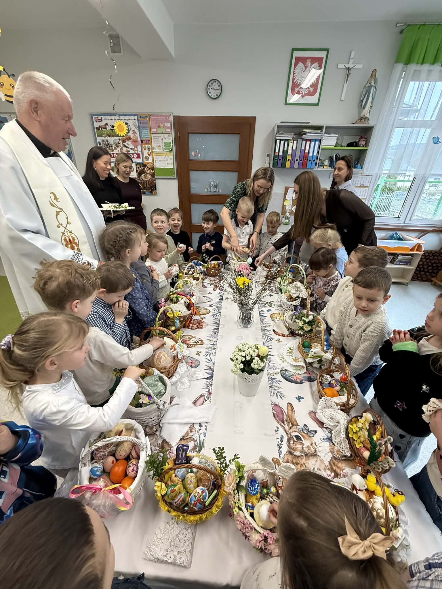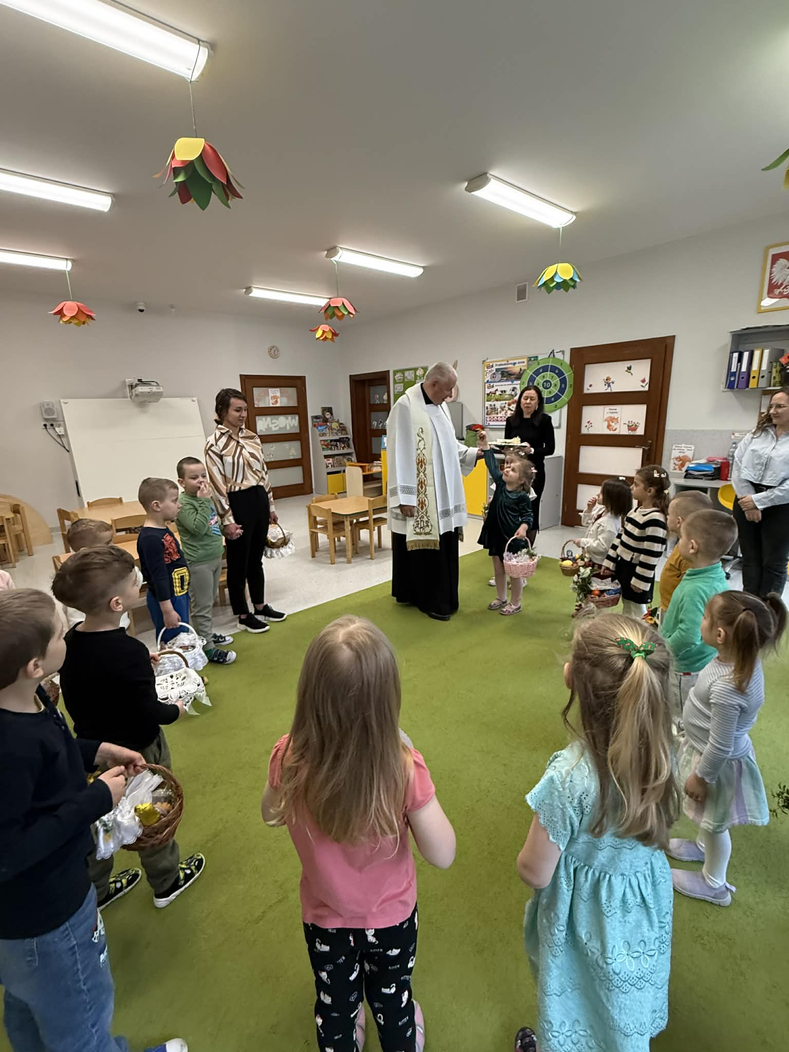 W atmosferze radości i przygotowań do nadchodzących Świąt Wielkanocnych w naszym przedszkolu parafialnym odbyło się uroczyste poświęcenie koszyczków z pokarmami. Dzieci, ubrane odświętnie, przyniosły pięknie przygotowane koszyczki wielkanocne. Nie zabrakło w nich tradycyjnych pokarmów, takich jak jajka, chleb, kiełbasa czy baranek - symbolizujących życie, dostatek i zwycięstwo Chrystusa nad śmiercią.